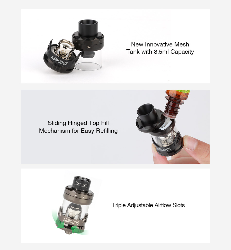 Viento Mesh Atomizzatore di asMODus è un serbatoio sub-ohm con bobina mesh da 0.18 ohm. Viene fornito con capacità E-jucie da 3.5 ml. Il serbatoio Asmodus Viento Mesh è dotato di un meccanismo di riempimento a cerniera duraturo. Le tre scanalature per il flusso d'aria regolabili sul fondo del serbatoio consentono un ampio ingresso dell'aria alle bobine. È specificamente progettato per Asmodus Minikin 3S Kit.