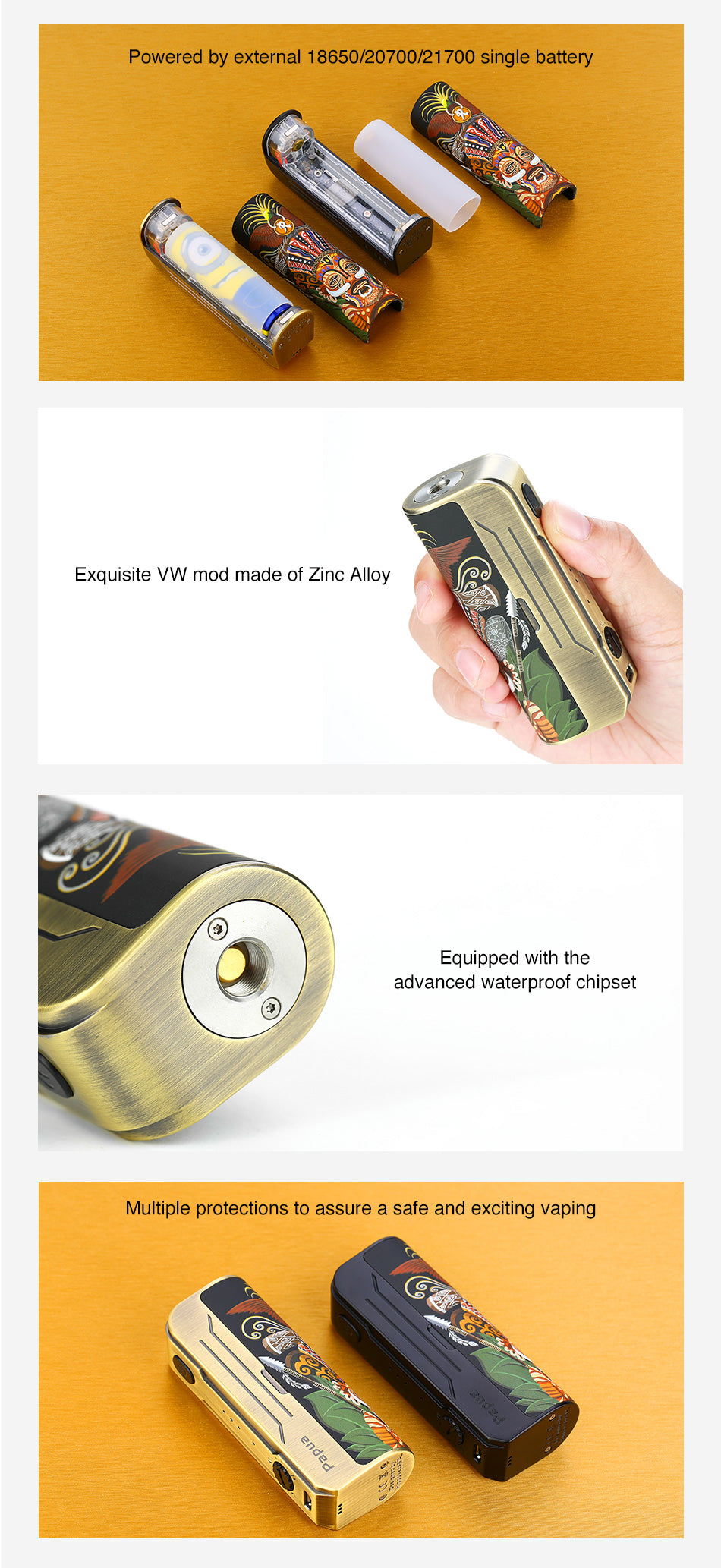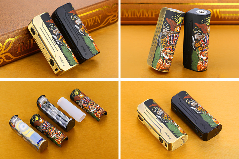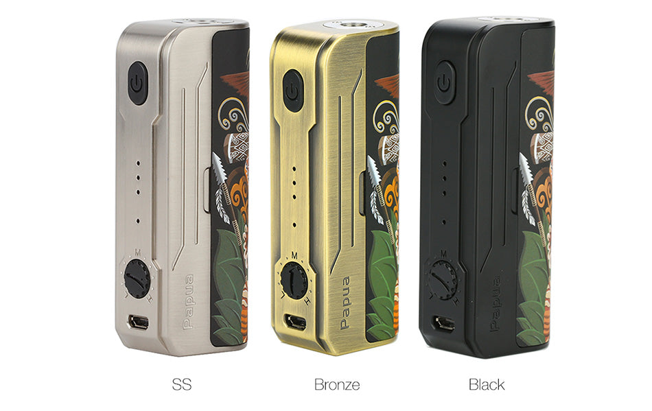 La Hippovape Papua Box MOD, il cui design è ispirato alla cultura della Papua in Indonesia, è disegnata da Hippovape e Railyway Vapers. Dotato del chipset impermeabile avanzato, alimenta da 3W a 100W e produce un'eccezionale precisione di potenza erogata dalla batteria 18650/20700/21700 (oltre 15c) che si accende in modo estremamente rapido. Dispone di 6 protezioni: protezione a bassa potenza, protezione da inversione di polarità, protezione da surriscaldamento, protezione da cortocircuito, protezione da taglio 10s e protezione da basso / alto ohm. La sua tensione di uscita varia da 1,0 V a 8 V e la sua resistenza va da 0,1ohm a 3,0ohm. Hippovape Papua MOD ti regalerà un'esperienza di svapo straordinaria.