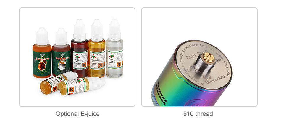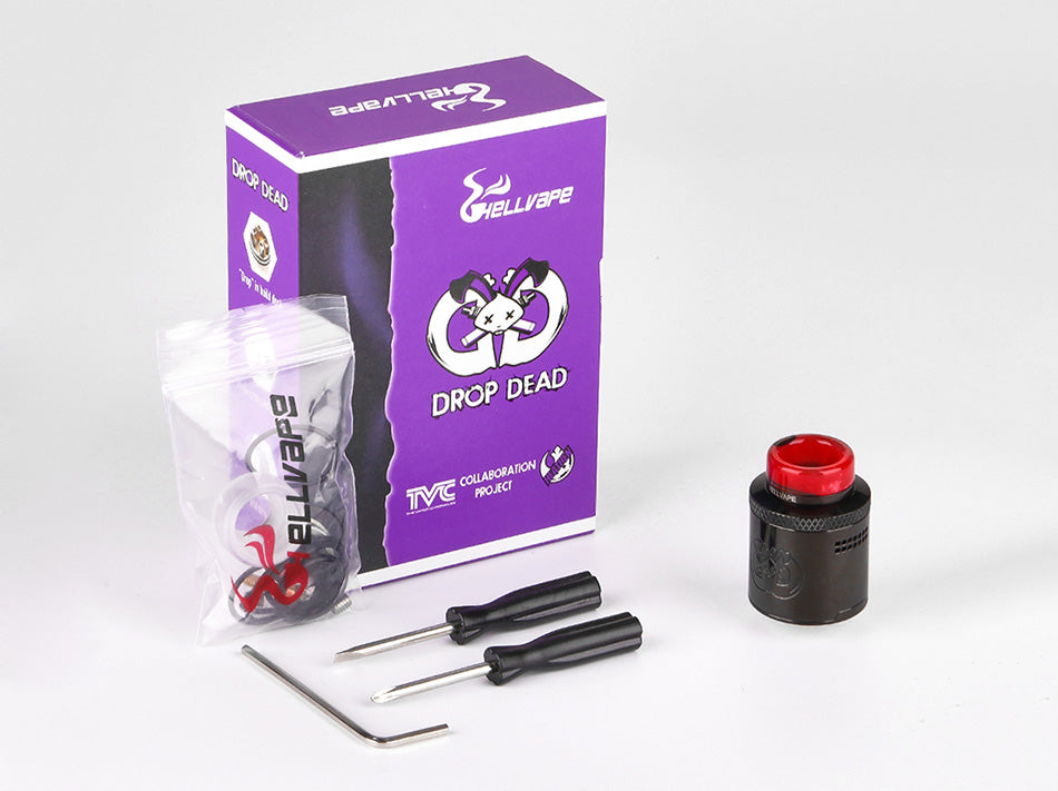Atomizzatore Dripping Ricostruibile Hellvape Drop Dead RDA Tank è co-progettato da Heathen, Le cronache Vapor (TVC) e Hellvape. Realizzato in resistente acciaio inossidabile con progettazione di alto livello, HellVape è diventato famoso da, c'è anche un logo iconico inciso sulla manica del muro. Con Diametro di 24 mm, ha quattro fori per le aste di grandi dimensioni per la costruzione semplice di bobine singole e doppie. Drop Dead è progettato con un innovativo flusso d'aria inclinato verso il basso, e puoi trovare 14 fori per il flusso d'aria in due file per offrirti un vapore estremamente fluido e gustoso. È dotato di una drip tip, ma all'interno di un adattatore 510 può anche essere abbinato a una drip tip 510. Preinstallato con drip tip in resina colorata, è disponibile un altro drip tip nero 810 per la sostituzione. Flusso d'aria più fluido, miglior deck, assenza di perdite, controllo preciso del flusso d'aria regolabile e molto altro ancora in Hellvape Drop Dead RDA! Disponibile in 10 colori.
