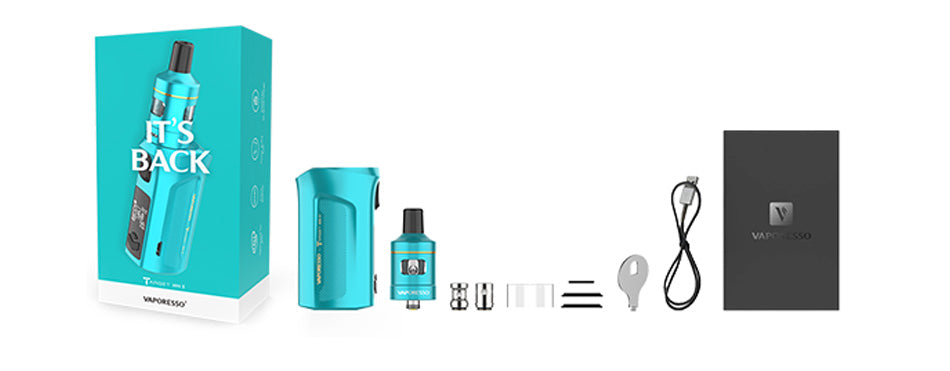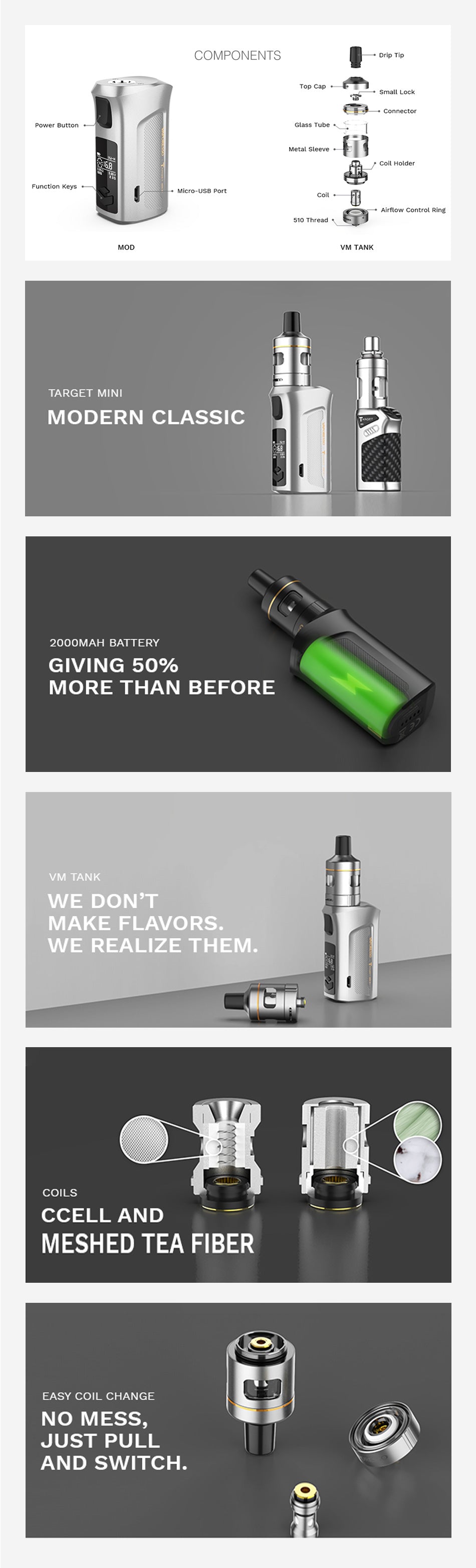 Vaporesso Target Mini 2 Kit include Target Mini 2 Mod e il serbatoio VM. Alimentato da una batteria integrata da 2000 mAh, con una gamma di potenza in uscita di 5-50 W, e la batteria può essere completamente caricata in 60 minuti. Sul quadrante di controllo, si ha un pulsante di accensione e due tasti funzione per azionare il dispositivo. Il display OLED da 0,66" per mostrare chiaramente i dati essenziali sullo svapo. Per quanto riguarda il Atomizzatore VM, può contenere fino a 2 ml di e-juice e viene fornito con due diverse opzioni di bobina. Una è la EUC MESHED Coil da 0,6 ohm che usa la fibra di tè, immergendo il succo in modo più uniforme per una nuvola più densa e un sapore consistente. L'altro è il brevettato 1.0ohm EUC CCELL Coil ti dà quello che ti serve da Nic-Salts e Oils. Per cambiare le bobine, basta girare il serbatoio e sostituirlo dal basso, senza problemi.