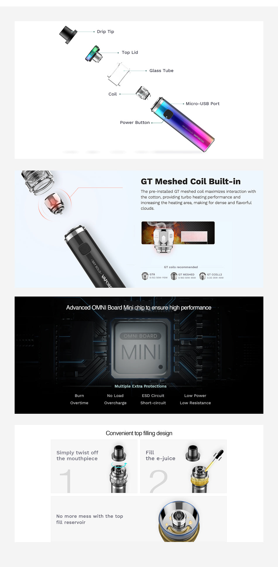 Coil: GT Mesh 0.18ohm (50-85W) (preinstallato), GT8 0.15ohm (50-110W) (venduto separatamente), GT CCELL2 0.3ohm (35-40W) (venduto separatamente)