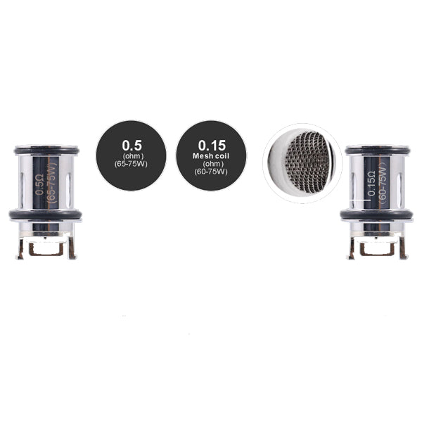 Coil: 0.5 ohm (65-75W)/ 0.15 ohm mesh coil (60-75W)