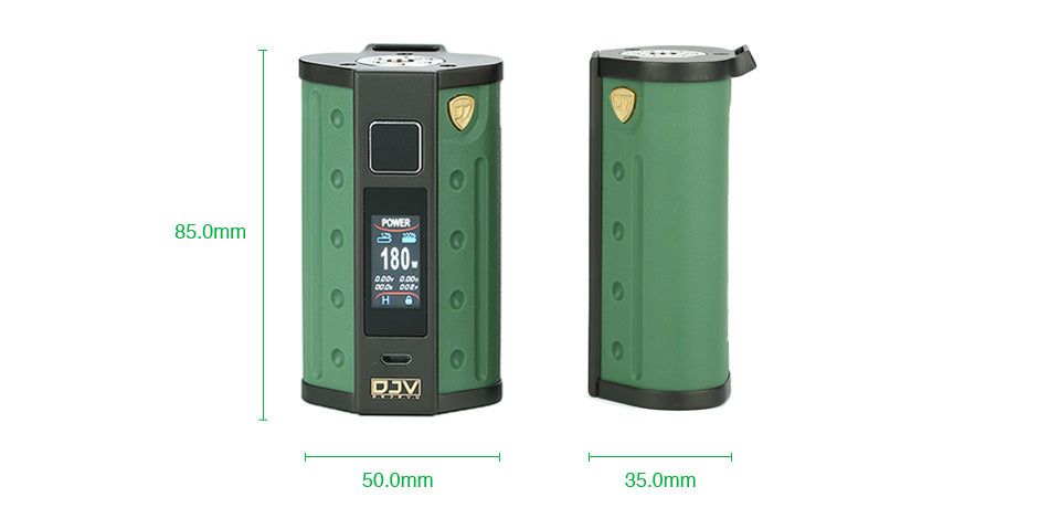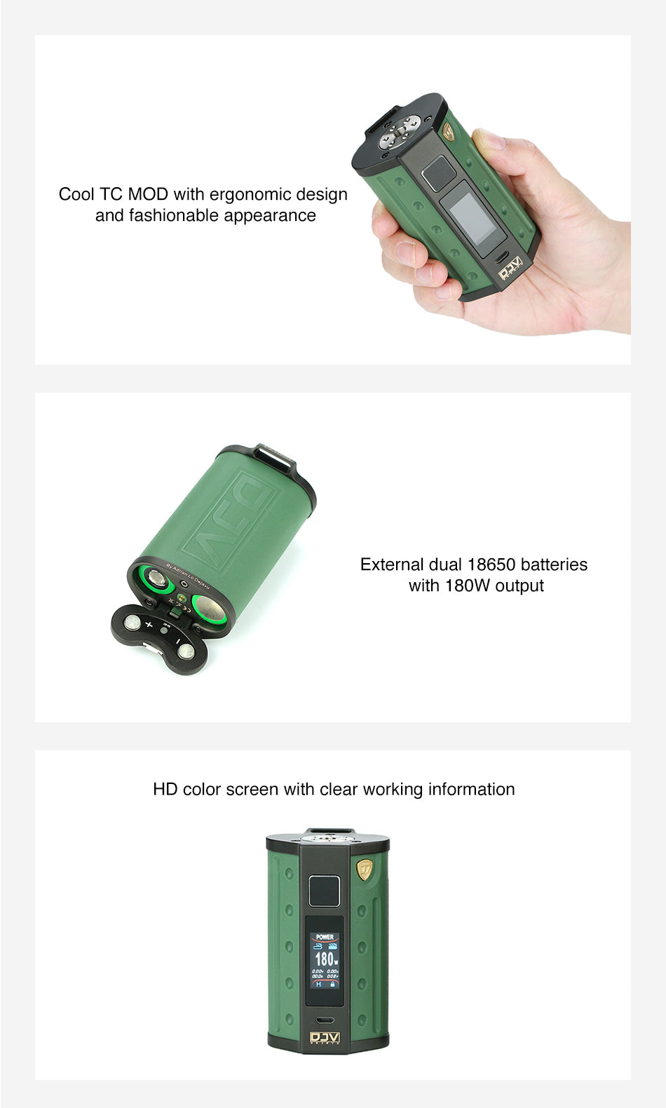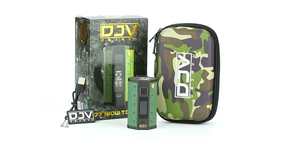 Ispirato al design delle armi e dell'arma del fucile, DEJAVU DJV D7 è un nuovo Touch Screen TC MOD con design ergonomico che utilizza il materiale abrasivo di qualità militare e il polimero. Alimentato da due batterie 18650, può facilmente alimentare fino a una potenza di uscita massima di 180 W e offrirti un ottimo sapore per lo svapo. Dotato di chip touchscreen UTC, DEJAVU DJV D7 MOD ti offrirà la comodità di operare.