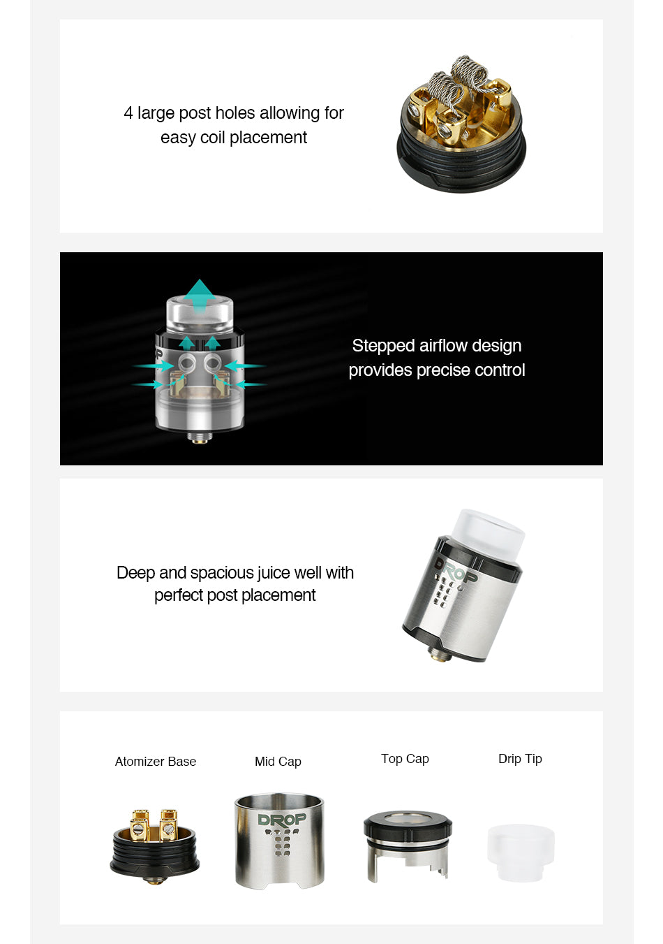 Drop RDA di Digiflavor è sicuramente diventato popolare in quanto è un dripper ricostruibile di alta qualità con un esclusivo mazzo a quattro colonne che utilizza più fessure di ventilazione orizzontali in una formazione a forma di T. Utilizzando i materiali e l'ingegno tra queste due grandi aziende, hanno progettato questa RDA con nuovi elementi e funzionalità mai viste prima. Il mazzo di costruzione per uno è completamente placcato in oro per la migliore connessione possibile e insieme ai disegni dei post per la costruzione delle bobine personalizzate, questo è un atomizzatore di gocciolamento ricostruibile pazzamente user friendly. Ci sono 12 fori che prendono aria su ciascun lato del telaio e questo viene fornito con una coppia di punte a drip tip da 810 a foro largo o un'opzione di 510. Questo DROP RDA è una cosa sicura per il tuo divertimento. Disponibile in 2 colori.