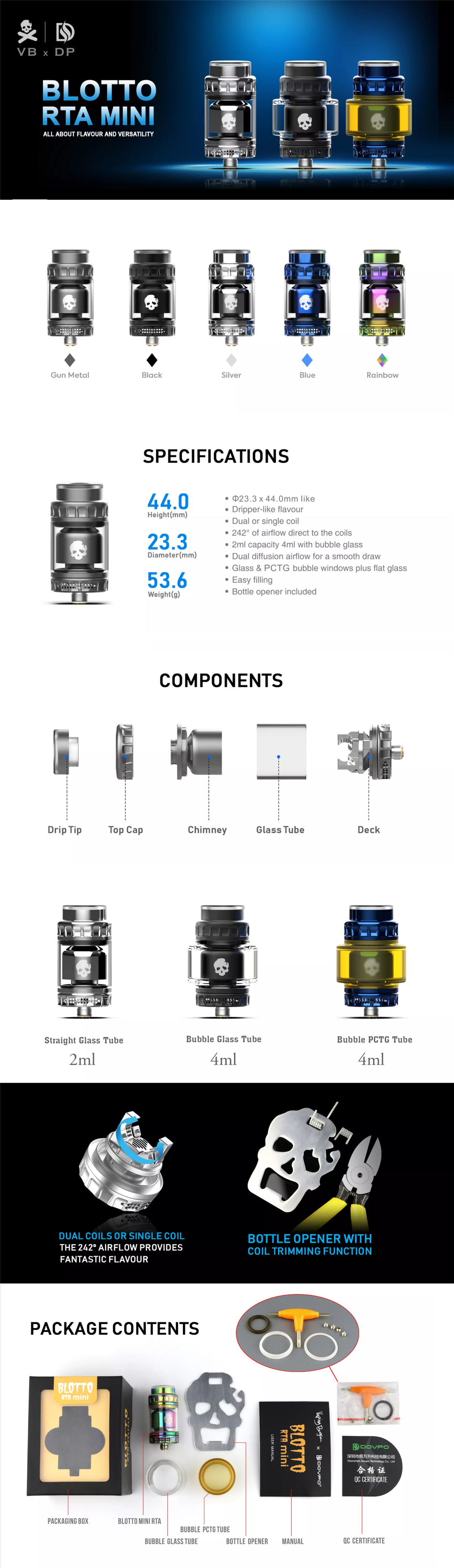Dovpo Blotto Mini RTA è la versione mini di Blotto RTA più leggera e più piccola, una collaborazione tra Vaping Bogan e Dovpo. Come un atomizzatore serbatoio ricostruibile, viene fornito con un vetro dritto da 2 ml e un vetro a bolle da 4 ml per offrire un'esperienza di svapo di lunga durata. E utilizza un comodo design di riempimento superiore per evitare perdite. Blotto Mini RTA continua il sistema di flusso d'aria a 242° e il ponte di costruzione a doppia o singola coil. È un flusso d'aria alimentato dal basso con fori a nido d'ape, in cui l'aria arriva attraverso il fondo del ponte e intorno ai lati, offrendo 242° di flusso d'aria che colpisce le bobine. Il sistema di flusso d'aria con presa d'aria interna fa risaltare la sua migliore produzione di aromi. Inoltre, è progettato con una struttura staccabile per una facile pulizia e sostituzione.