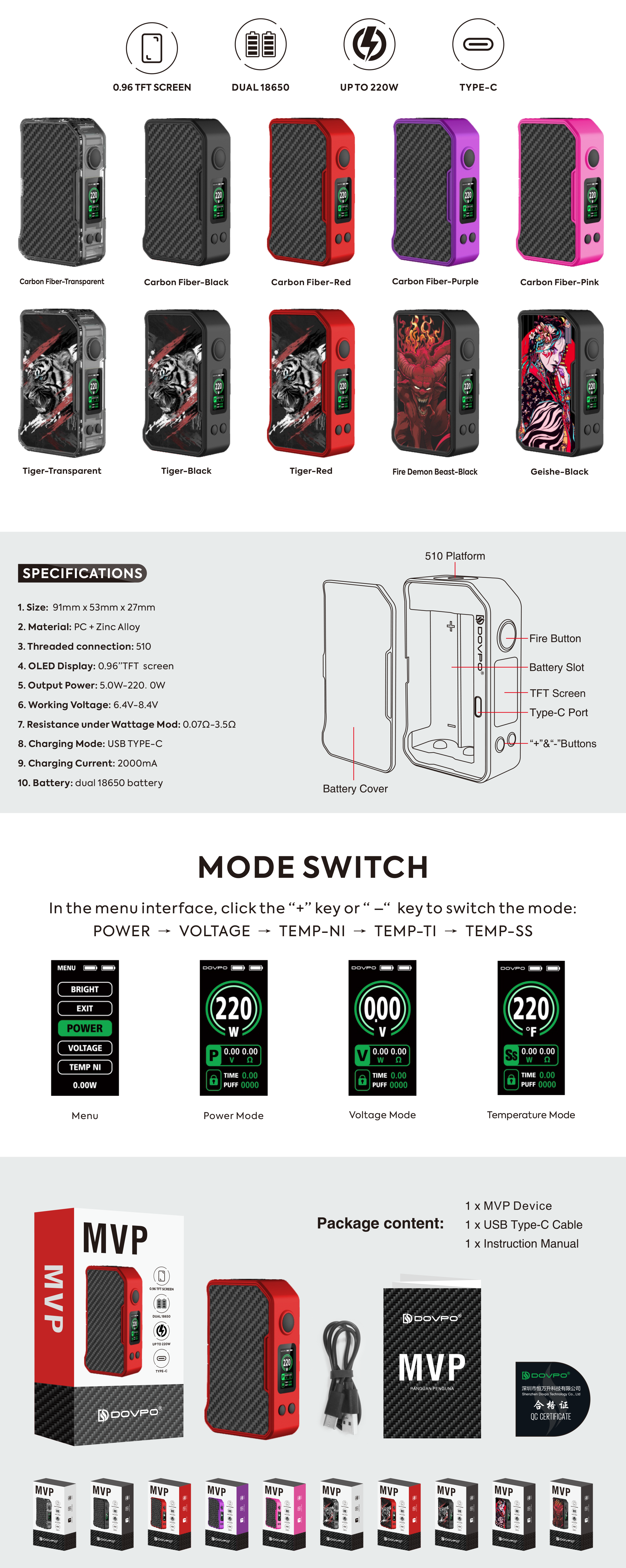 Dovpo MVP 220W Box Mod è alimentato da due batterie esterne 18650 (non incluse) con potenza 5W-220W. Ha la modalità Power/Voltage/Temp per la tua opzione. Dispone inoltre di schermo TFT da 0,96 e ricarica di tipo C. DOVPO MVP Mod supporta atomizzatori da 0,07Ω a 3,5Ω di resistenza.