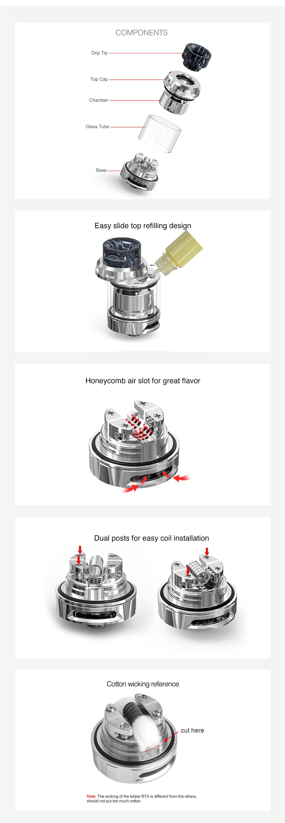 Ehpro Kelpie RTA è progettato da Vaping With Vic e prodotto da Ehpro. Ehpro Kelpie è un atomizzatore per serbatoio ricostruibile perfettamente progettato con capacità di 2 ml, in grado di soddisfare facilmente il tuo svapo quotidiano. La confezione include anche un tubo a bolle da 3,5 ml per la conservazione di grandi quantità di succo. Il succo entra nell'Ehpro Kelpie attraverso un sistema di riempimento superiore a un quarto di giro e sotto il tappo superiore è presente un anello di silicone per evitare perdite. Viene fornito con fessure d'aria a nido d'ape, e il flusso d'aria colpisce direttamente la bobina, che porterà un grande sapore per te. L'Ehpro Kelpie RTA adotta anche un deck di costruzione dual-post per una facile installazione della bobina. Caratterizzato da due innovativi sistemi per la costruzione di bobine e un facile assorbimento del cotone, porterà il miglior sapore e inseguirà i vapori di nuvola.