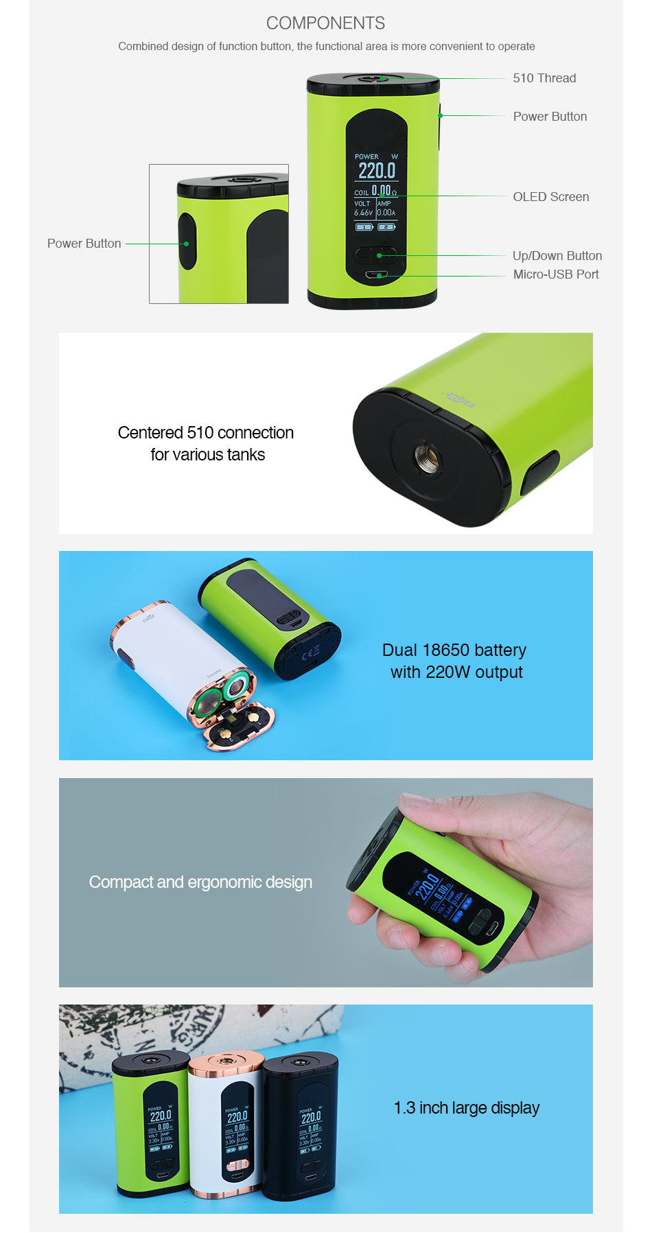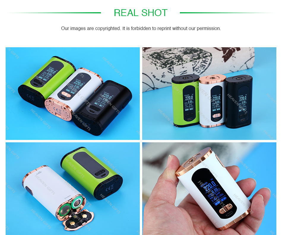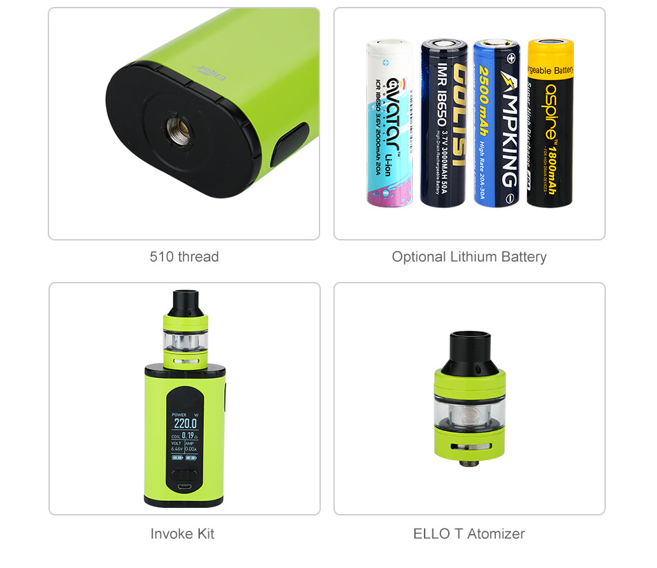 Eleaf Invoke 220W TC Box Mod è nuovissimo APV di Eleaf. Si tratta di un MOD 220W 22050 a doppia alimentazione con controllo della temperatura. Il connettore 510 per il Tank è caratterizzato da un eccellente bilanciamento e un'usabilità a portata di mano. Un ulteriore bonus del Tank montato al centro è la capacità di gestire serbatoi fino a 27 mm di diametro senza NO OVER-HANG! L'ampio display da 1,3 pollici rende il controllo e il monitoraggio del MOD un gioco da ragazzi grazie all'interfaccia utente intuitiva. Lo starter kit include anche il nuovissimo atomizzatore ELLO T sub ohm. Disponibile in 4 colori.