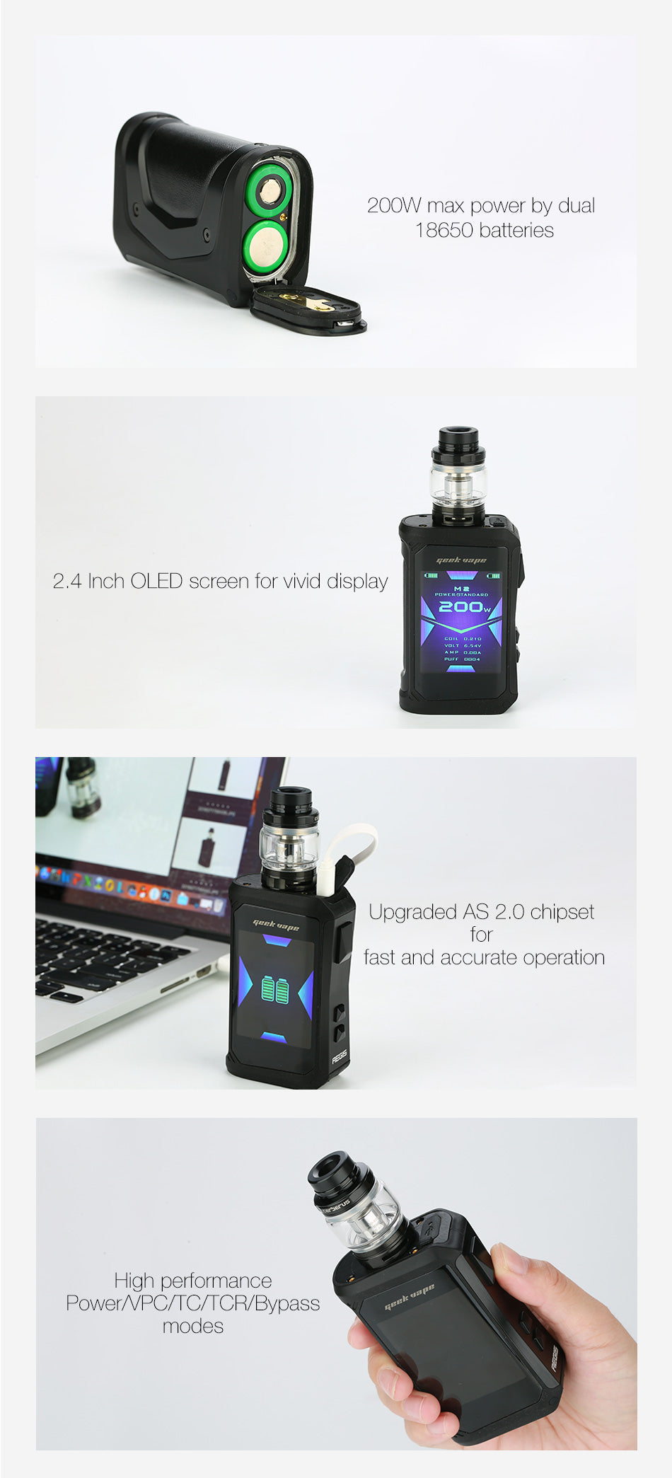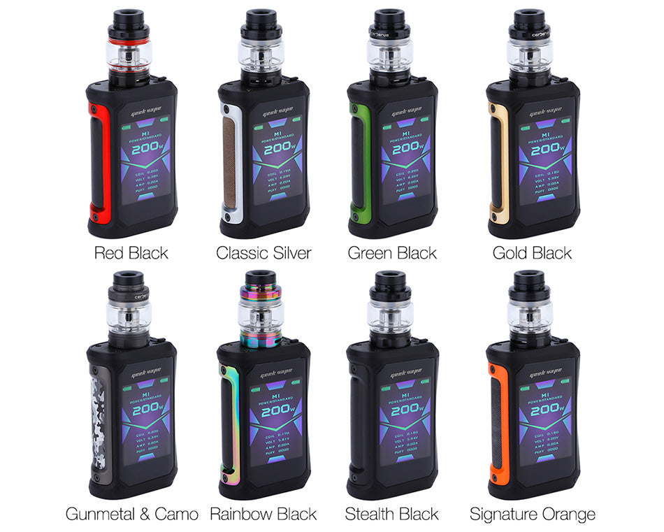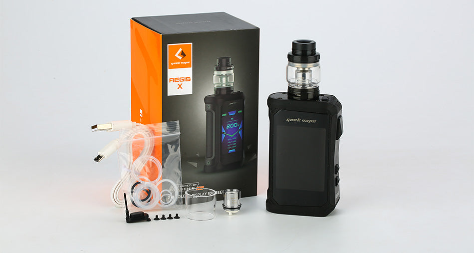 Geekvape Aegis X Kit combina Aegis X Mod con Cerberus Sub Ohm Tank per offrire un'esperienza di svapo perfetta. Come kit TC box mod più potente ed eccellente della classica famiglia Aegis Geekvape, Aegis X MOD è alimentato da due batterie 18650 con chipset AS 2.0 aggiornato per fornire una potenza di uscita massima di 200 W e fornire modalità VW / TC / VPC veloci e accurate. È dotato di schermo colorato OLED da 2,4 pollici per visualizzare i dati di svapo dettagliati. E l'innovativo serbatoio Cerberus Subohm ha una capacità di e-juice di 5,5 ml / 4 ml e un facile riempimento superiore. Con l'innovativo sistema a bobina super mesh e il design del flusso d'aria inferiore regolabile, ti offrirà una fantastica esperienza di sigaretta elettronica. Inoltre, presenta ancora resistenza all'acqua e alla polvere IP67 e un'elevata resistenza agli urti per una sensazione di mano confortevole e un uso durevole.