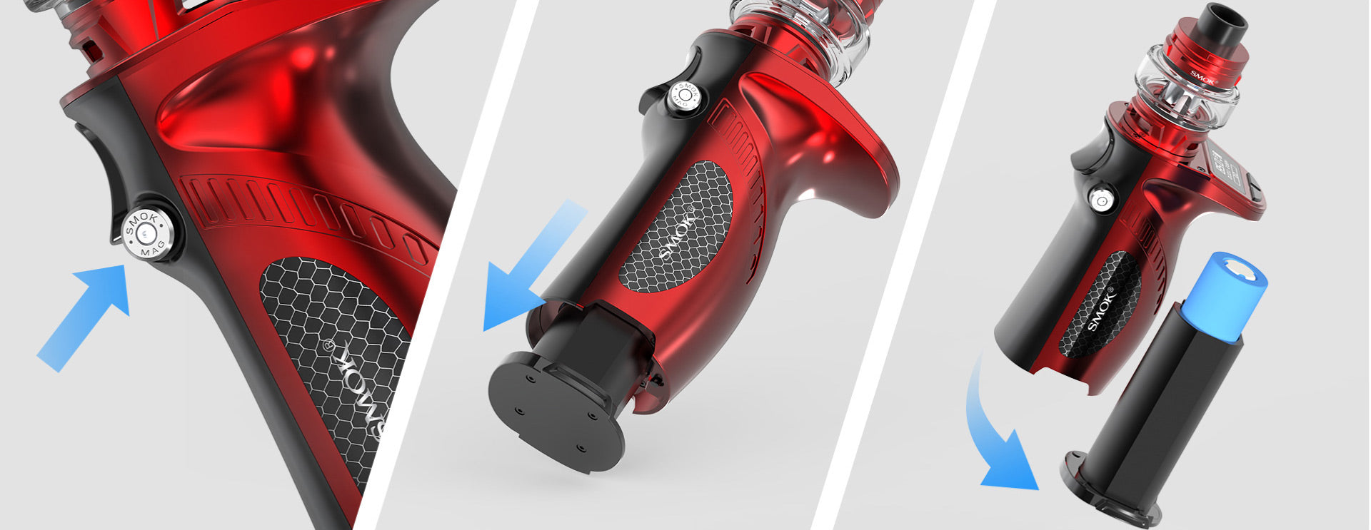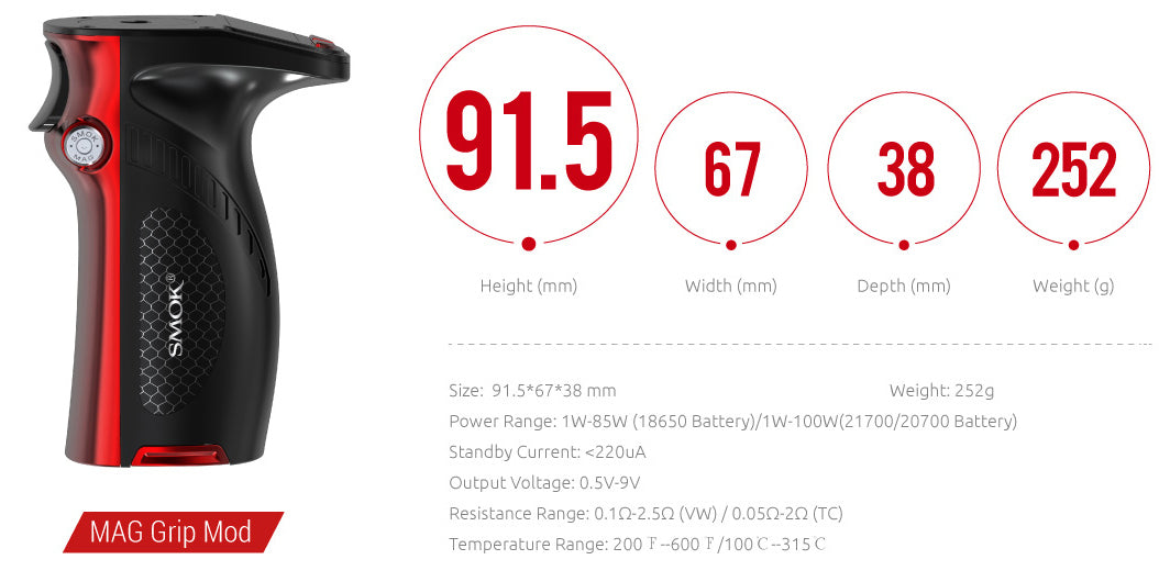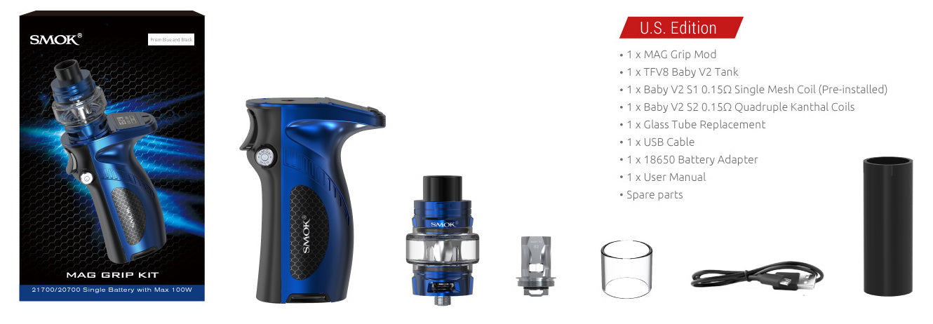 SMOK Mag Grip Kit è nuovo membro della famiglia MAG, che continua ancora le caratteristiche di un mod palmare, una chiave di fuoco squisita e una versione rivista. Il SMOK Mag Grip adotta anche un pulsante a forma di moneta per l'installazione della batteria. Presentando una singola piattaforma 18650/20700/21700 con chipset intelligente pur mantenendo un sensazionale elemento ergonomico con un'impressione visivamente sbalorditiva, fornendo una potenza massima di 100W / 85W. Ma questa volta lo schermo del display è stato progettato diversamente dal precedente Mag, uno schermo OLED da 0,66 pollici con alta definizione è vicino alla piastra 510, fornendo un angolo di visione più conveniente per l'utente. L'atomizzatore TFV8 Baby V2 viene fornito con capacità di succo da 5 ml e nuovo Baby V2 S1 Single Mesh Coil / Baby V2 S2 Quadrupla Kanthal Coil. 4 colori sono disponibili.
