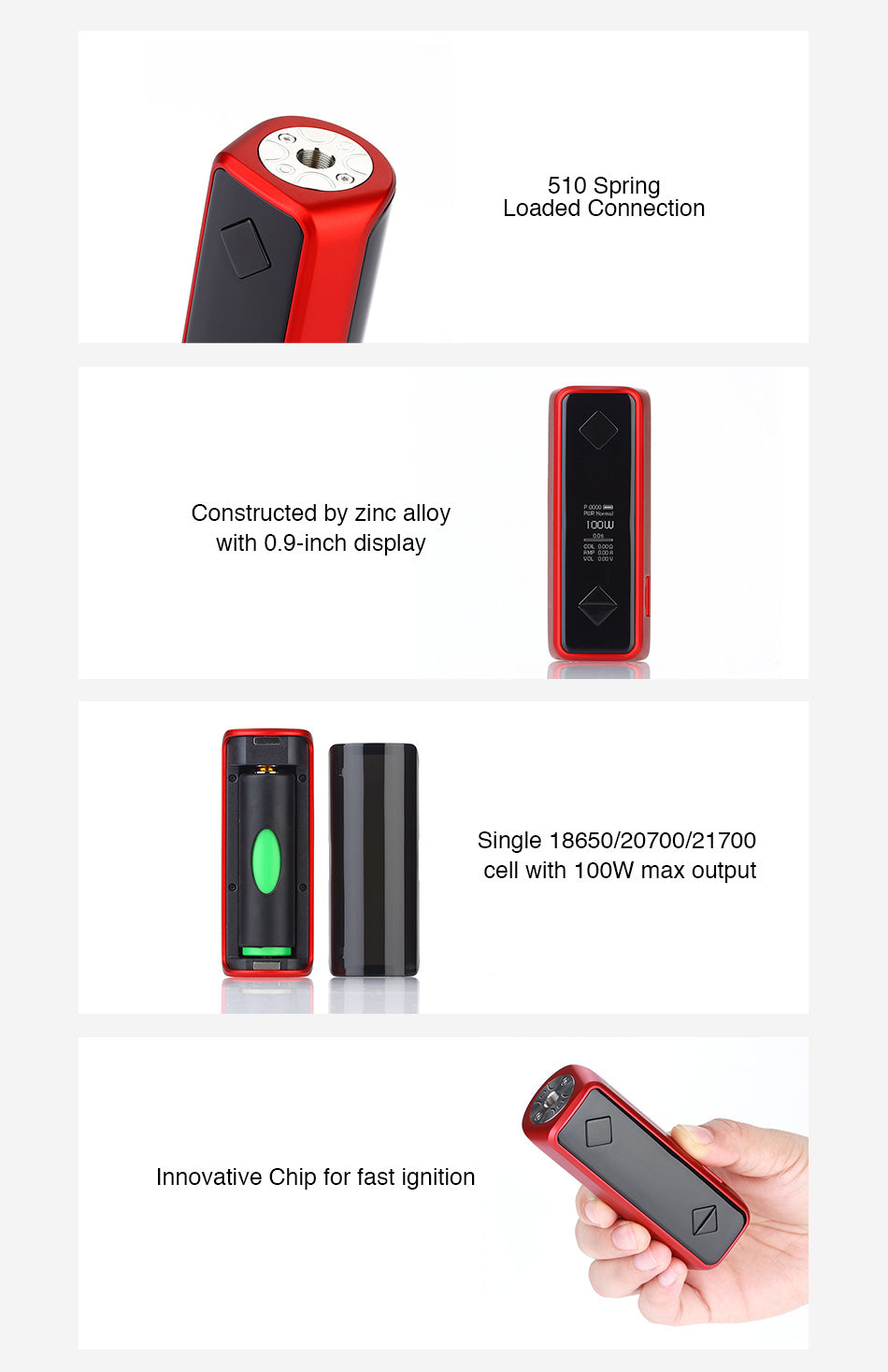 Hotcig G100 Box Mod è dotato di un innovativo chip che porta una velocità di sparo veloce di 0,5 ms e il display da 0,9 pollici che mostra tutti i dati in modo chiaro. È alimentato da una singola cella 18650/20700/21700 e supporta un'uscita massima di 100W. La mod può essere commutabile tra le modalità TC / VW / Bypass e offrirti varie esperienze di svapo. Inoltre, ha una velocità di sparo di 0,5 ms.