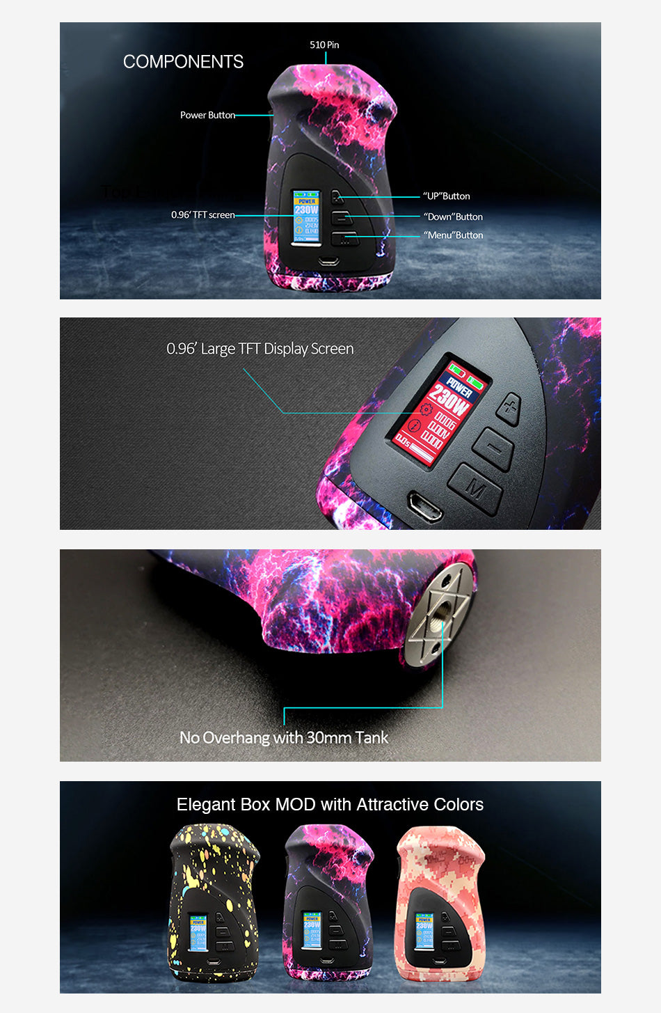 Hugo Vapor Orbiter 230W TC Box Mod è una superlight mod realizzata in nylonfibre e acciaio inossidabile. Progettato in forma ergonomica, offre sensazioni confortevoli da impugnare. Orbiter è abbastanza diverso dalle altre mod, poiché adotta una forma unica e trasmette in qualche modo la cultura dei graffiti. Alimentato da due batterie 18650, ha un'uscita massima di 230W e supporta le modalità VW / TC / TCR, la modalità cliente esclusiva e la funzione di preriscaldamento.