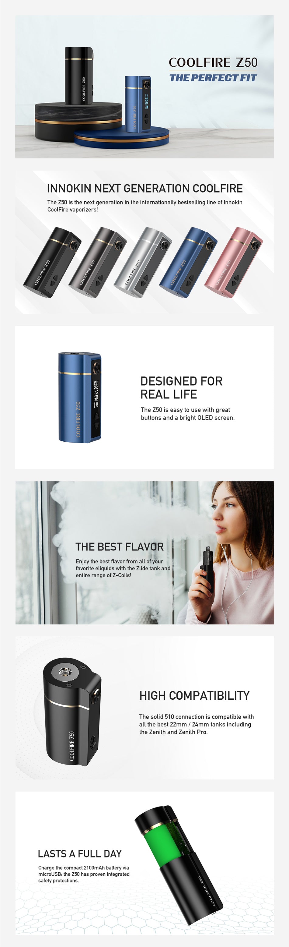 Ecco la Innokin CoolFire Z50 Box Mod con grande batteria integrata da 2100 mAh che fornisce lo svapo ad alta potenza (6 ~ 50 W) per te. Puoi ottenere una ricarica rapida 1A con micro USB e possiede protezioni di sicurezza integrate. Inoltre, è progettato per la vita reale, facile da usare con pulsanti fantastici e uno schermo OLED luminoso.