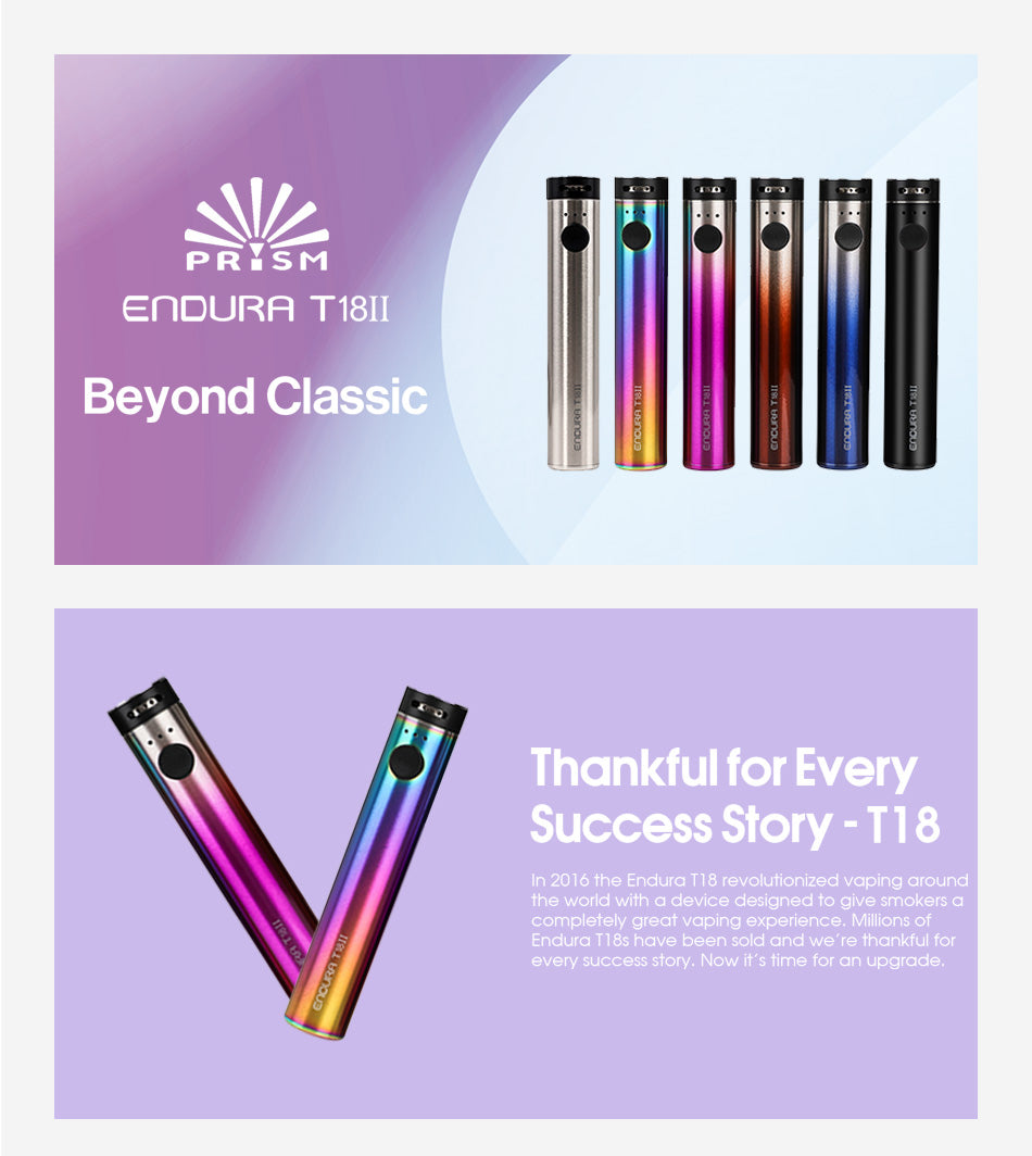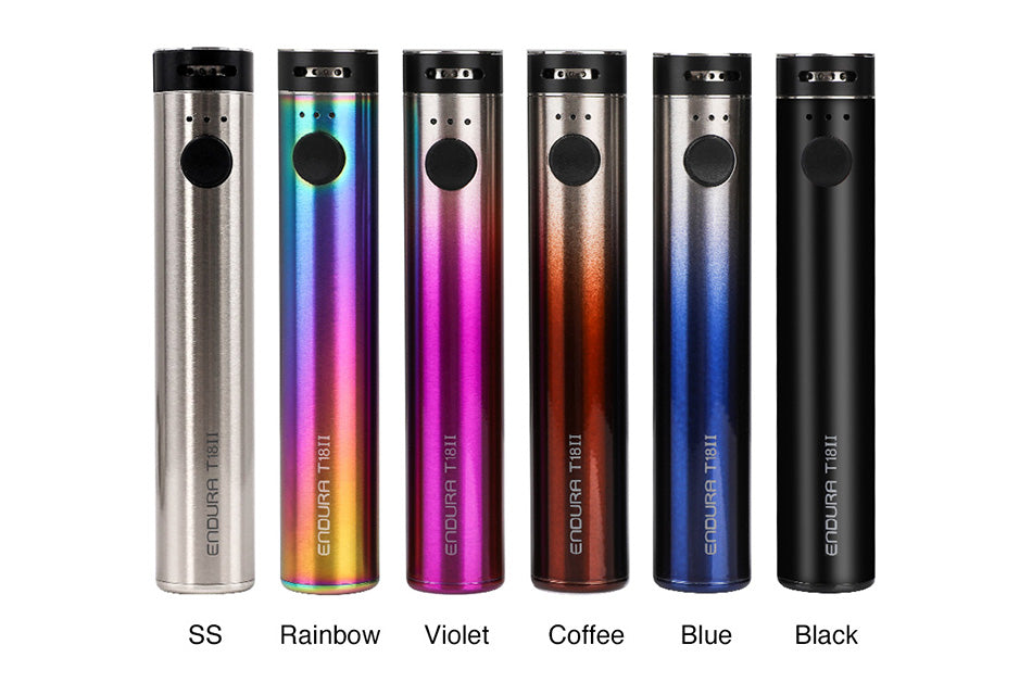 La batteria Innokin Endura T18 II, la versione aggiornata della batteria T18. L'Endura T18 II funziona con una batteria interna da 1300 mAh che si carica tramite micro USB e presenta la modalità di alimentazione che ha tre impostazioni di wattaggio freddo (10,5 W), medio (12 W) e caldo (13,5 W) per la selezione in base alle preferenze personali.