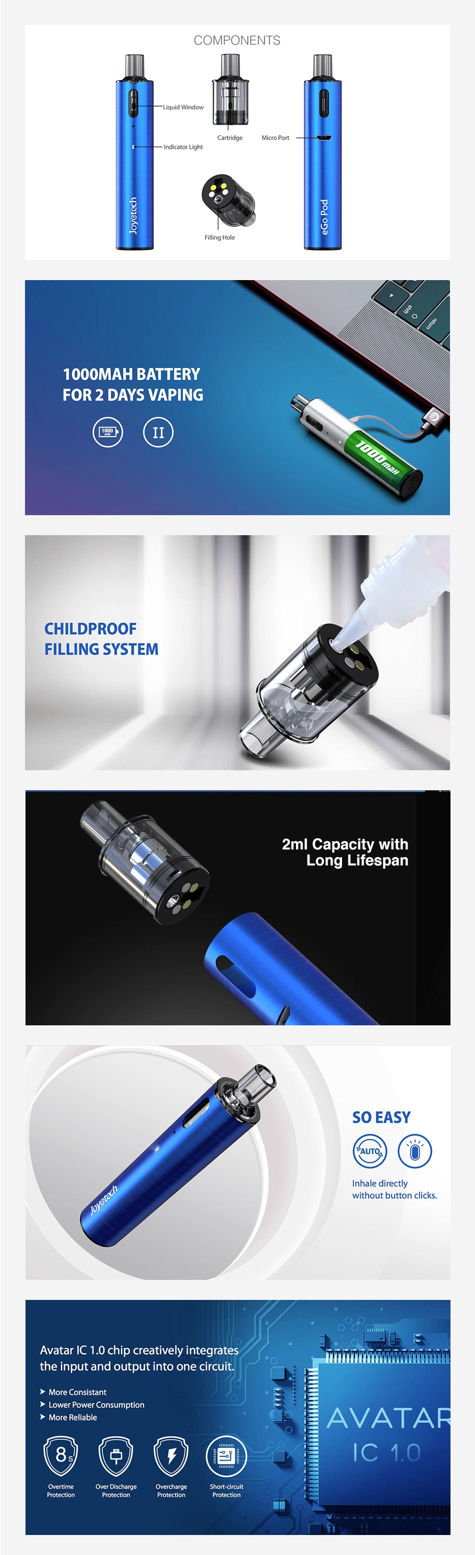 La filosofia di progettazione di Joyetech eGo Pod Kit è Easy è perfetta! Joyetech eGo Pod Kit adotta un circuito integrato per un'uscita di corrente stabile e una lunga durata. È alimentato da una capacità della batteria di 1000 mAh e viene fornito con una capacità di e-juice da 2 ml. eGo Pod può essere utilizzato con Freebase, Nic o Nic Salt. Dotato di design a blocco per bambini e facile da ricaricare, il kit Joyetech eGo pod ti offrirà un'esperienza di svapo sicura e meravigliosa.