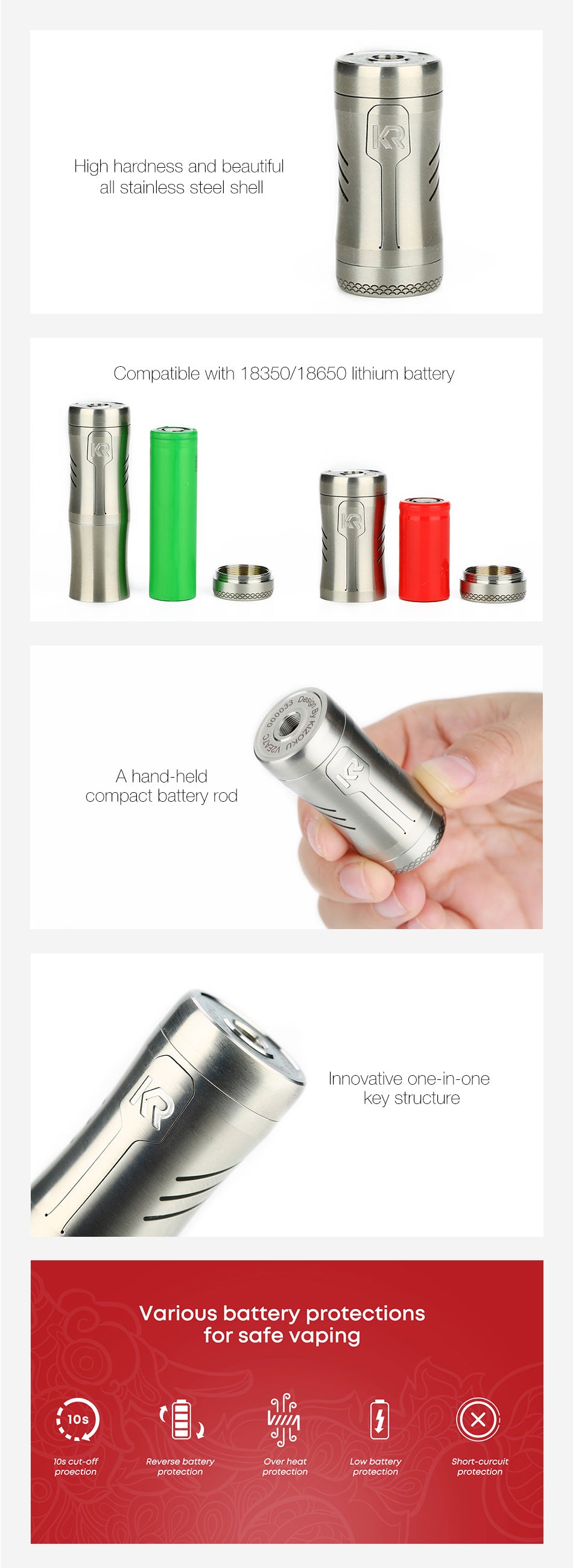 La Kizoku Kirin Mod è una mod Tube Semi-Mech molto compatta e portatile. Il guscio di Kirin Tube Mod è realizzato in tutto il materiale in acciaio inossidabile, possiede la perfetta combinazione di super durezza e aspetto estetico. Dotato di funzioni di alimentazione versatili, il Kirin potrebbe essere alimentato da 2 diversi tipi di batterie. La mod Kirin è compatibile con la batteria 18350 e può essere estesa alla batteria 18650 con il tubo esteso 18650, che soddisfa le diverse esigenze. Fornisce una tensione costante di 3,5 V. Con l'aiuto dell'adattatore, la sua altezza può essere regolata in base alla batteria installata.