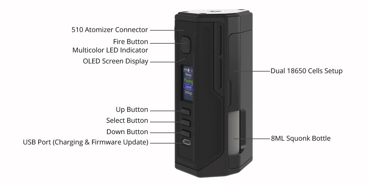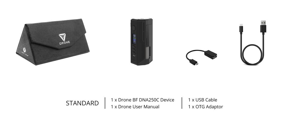 Lost Vape Drone BF Squonk DNA 250C Box Mod è la versione aggiornata della prima edizione di Drone BF. Alimentato da due batterie 18650, il Drone BF DNA 250C può generare fino a 200 W di potenza massima. The Lost Vape Drone BF Squonker DNA250C TC Box Mod è impostato per entrare nel segmento squonk-ready in modo spettacolare, presentando un design del telaio splendidamente realizzato che Lost Vape è diventato famoso insieme all'integrazione del chipset DNA 250C di Evolv. Con la bottiglia da 8ml squonk, Drone BF 250C Mod ti permette di cogliere un tempo di squonking più lungo e potente. Può svapare durante la ricarica e l'OTG consente a Drone DNA250C di recidere come power bank per altri dispositivi di supporto USB.