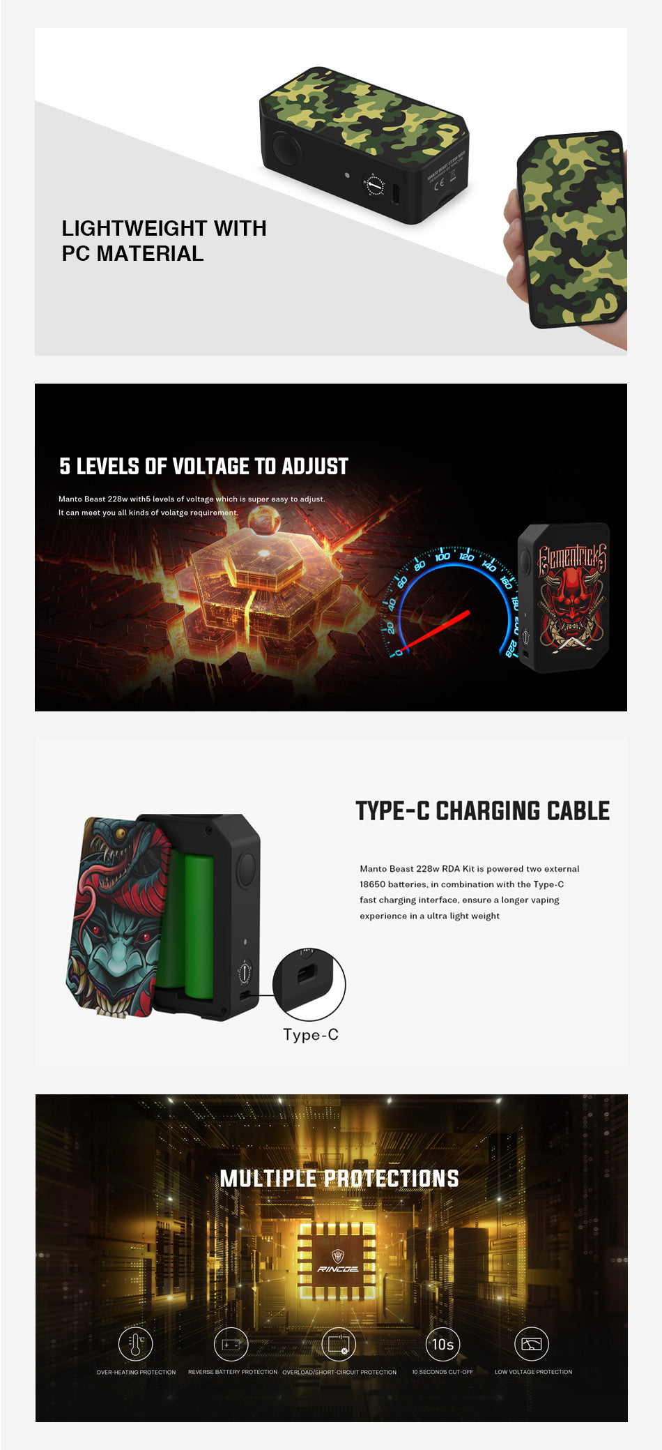 Il Rincoe Manto Beast VV MOD è un vero dispositivo bestia nuvola per vapers DTL. Rincoe Manto Beast è dotato di una funzione di tensione variabile di 5 livelli, alimentato da due batterie 18650, Rincoe Manto Beast MOD ha una potenza elevata di max 228W. Il telaio del PC e le curve rendono il corpo ergonomicamente adatto alla tua mano. Ci sono 5 livelli di tensione che puoi regolare. La porta di ricarica di tipo C garantisce una ricarica rapida e consente di risparmiare più tempo. Inoltre, offre anche protezioni multiple: Protezioni multiple: surriscaldamento / inversione della batteria / sovraccarico / cortocircuito / 10s Cut-Off / protezione bassa tensione.
