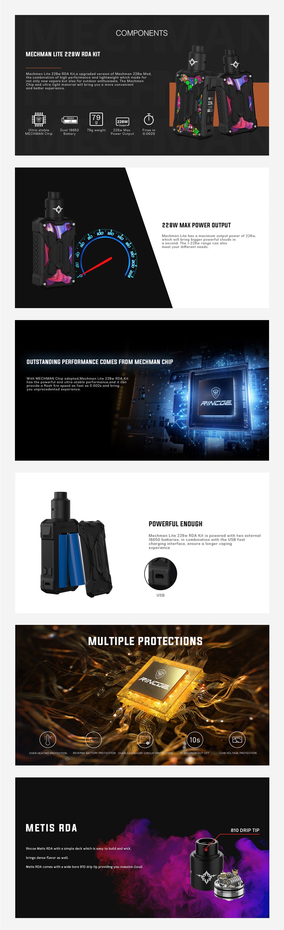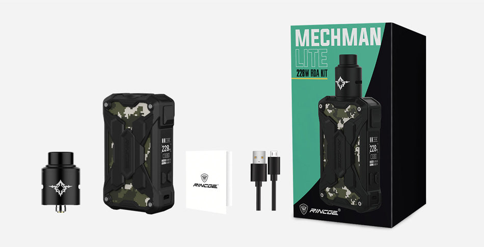 Il kit Rincoe Mechman Lite 228W RDA è una versione semplificata del kit originale Mechman 228W, che offre una migliore esperienza di svapo. È un kit leggero e resistente che ha un aspetto unico ed ergonomico. Il kit Rincoe Mechman Lite 228W RDA è composto da un Rincoe Mechman Lite Mod e da un Metis RDA. Il kit Rincoe Mechman Lite adotta Mechman Chip e materiale ultraleggero, nato non solo per i nuovi vapers ma anche per gli appassionati di attività all'aperto. Con il chip MECHMAN e le doppie celle 18650 ad alta scarica, la mod Rincoe Mechman Lite Box può erogare una potenza massima di 228 W e fornire una velocità di fuoco del flash fino a 0,002 secondi. Inoltre, la mod Rincoe Mechman Lite possiede una temperatura regolabile da 100 ° C a 315 ° C e una potenza regolabile da 1W a 228W. Non preoccuparti del problema della batteria del dispositivo Rincoe Mechman Lite, che è dotato di una porta di ricarica USB veloce, puoi avere un'esperienza di svapo più lunga. Inoltre, il dispositivo Rincoe Mechman Lite è dotato di Rincoe Metis RDA che ha un mazzo semplice da costruire e da stivare facilmente. Oltre a una punta a goccia 810 a foro largo, Metis RDA ti offrirà un sapore denso e una nuvola enorme.