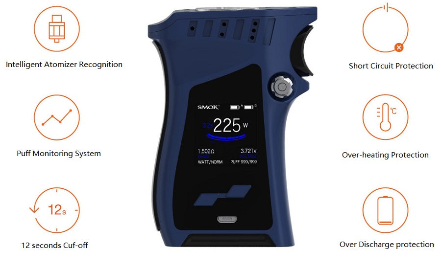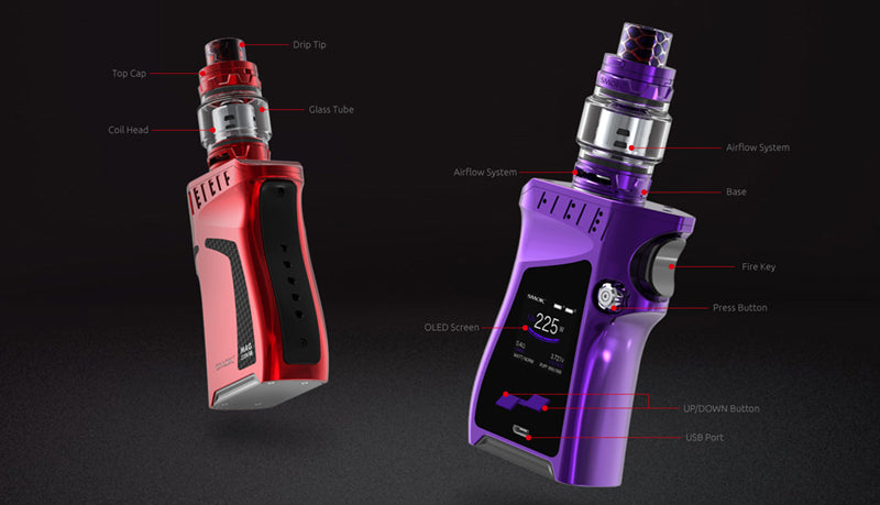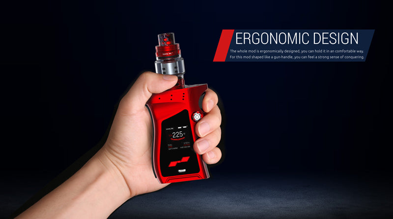 Lo SMOK MAG 225W Starter Kit è dotato del design più ergonomico, a forma di impugnatura di pistola. Il design strutturale della SMOK Mag 225W TC Box Mod è realizzato con un futuristico quadrante di controllo lungo il telaio ispirato al grilletto, aerodinamico con un comodo poggiapolsi e un interruttore di accensione sovradimensionato. Inoltre, l'installazione della batteria del doppio amplificatore 18650 (venduto separatamente) viene aperta tramite un pulsante a forma di fiore situato sul lato del viso, consentendo l'accesso al vano batteria scorrevole. Il Mag 225W è costruito con la più recente tecnologia SMOKTech, presentando uno schermo OLED a colori completamente personalizzabile e user-friendly che fornisce dati essenziali a colpo d'occhio con display vivaci. Il Mag offre una potenza massima di 225 W e una pletora di regolazioni di uscita che vanno dalla suite di controllo della temperatura con la modalità Memoria aggiunta per una maggiore precisione e una protezione completa. Ogni kit è abbinato al nuovo atomizzatore SMOK TFV12 Prince, che presenta una capacità massima di 8 millilitri, un nuovo sistema di rabbocco a cerniera con chiusura a pulsante, doppio controllo del flusso d'aria a doppio fondo e il sistema TFV12 Prince Coil. Eccezionalmente progettato con sorprendente abilità visiva e realizzato ergonomicamente con l'atomizzatore Prince TFV12, lo SMOK Mag 225W TC Starter Kit è destinato a diventare il nuovo sistema prolifico del settore.