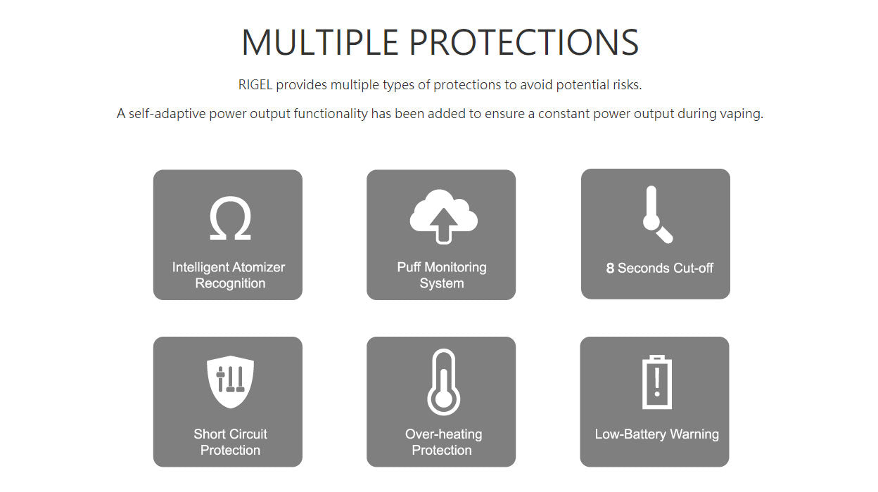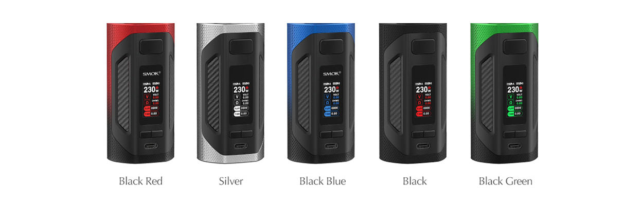 SMOK Rigel Box Mod è un vape box mod ad alte prestazioni, progettato ergonomicamente, con un rivestimento in gomma morbida e una superficie in fibra di carbonio e innumerevoli fori a nido d'ape in una distribuzione ordinata per fornire una presa confortevole e un senso di manipolazione. Rigel Mod è alimentato da due batterie 18650 esterne, che possono fornire una potenza massima di 230 watt, offrendoti un'esperienza di svapo duratura. Rigel Box Mod è dotato di uno schermo TFT a colori da 0,96 pollici sulla parte anteriore per visualizzare chiaramente i dati di svapo. Rigel Mod fornisce anche una serie di misure di protezione per evitare potenziali rischi. E ha aggiunto una funzione di uscita della potenza adattiva per garantire una potenza costante durante lo svapo.