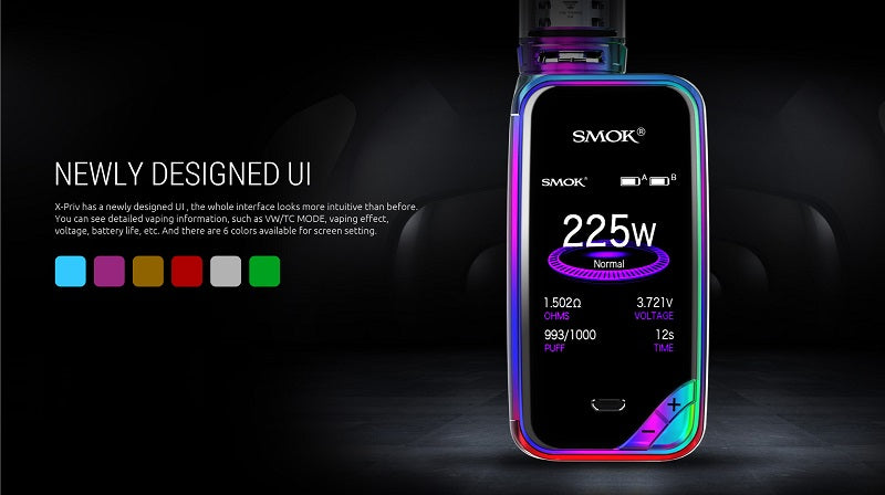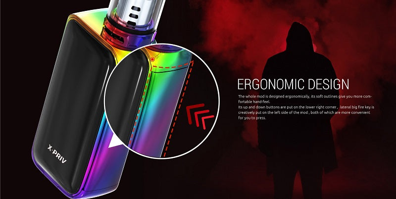 SMOK X-Priv 225W TC Box Mod è un design ergonomico e creativo di SMOK. Impiega materiale appena vetroso per una sensazione di mano confortevole, adotta lo schermo colorato ad alta definizione e la chiave antincendio lato sinistro che è più facile da usare rispetto a prima. La mod X Priv box funziona con due batterie 18650, offre una potenza massima di 225W. Ci sono anche tre mod di output tra cui scegliere: TC, VW e Modalità di memoria. Quando accoppiato con il carro armato TFV12 Prince, X-Priv ti farà godere appieno del grande vapore.