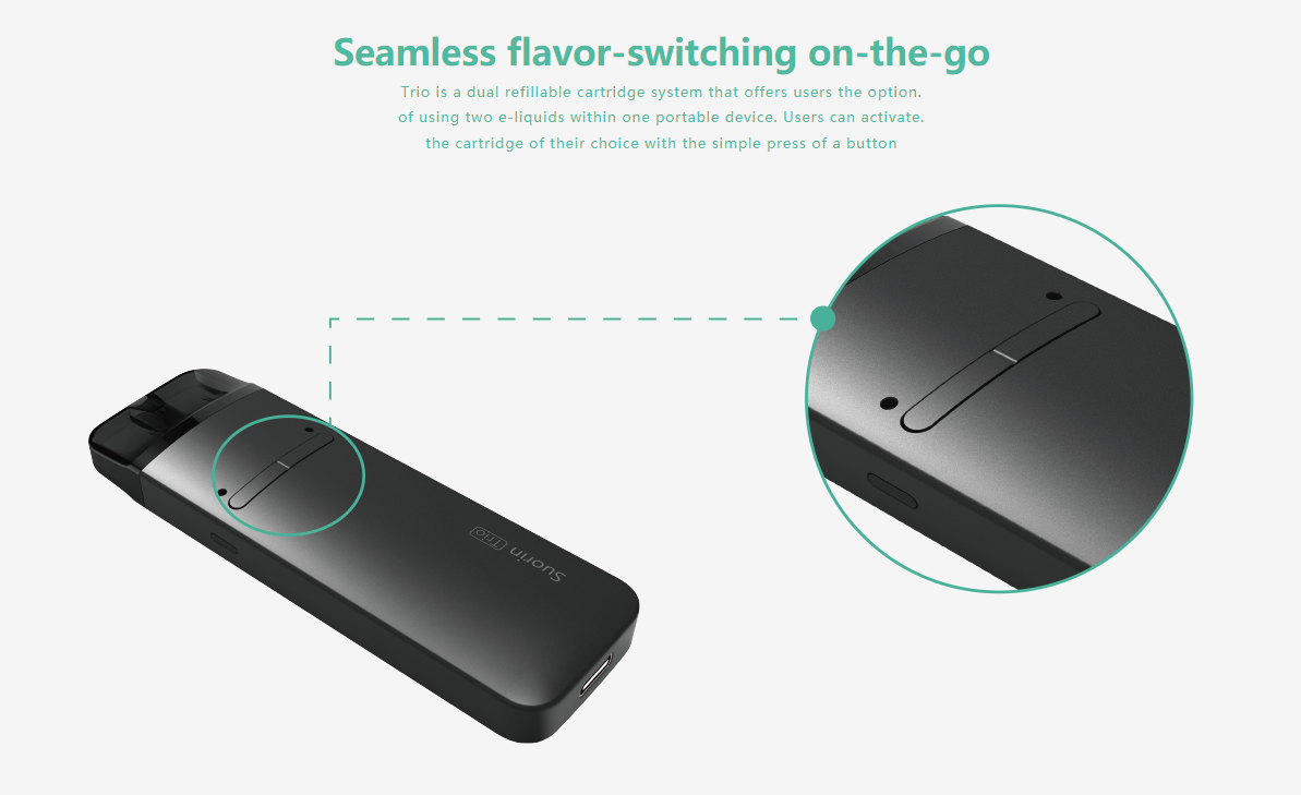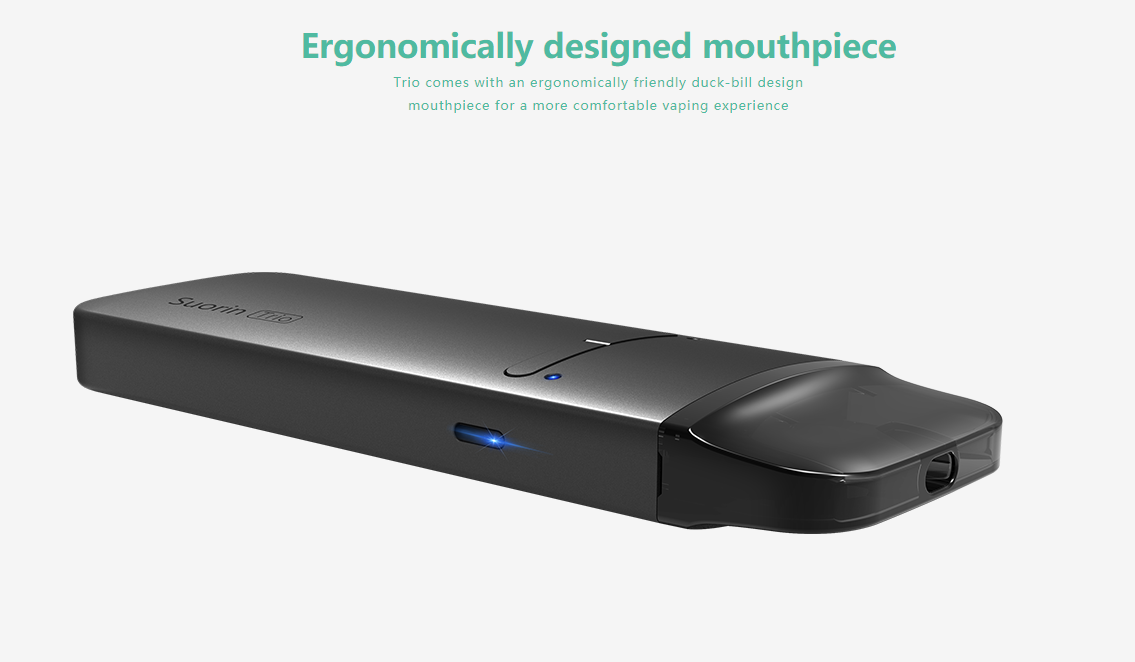 Il Suorin Trio Kit è il più recente sistema di pod di svapo offerto da Suorin, che implementa una grande batteria ricaricabile da 850 mAh, un doppio pod aromatizzato e possiede un elegante sistema di blocco per impedire a bambini e adolescenti di utilizzare o sparare accidentalmente il dispositivo. È dotato di un indicatore di potenza a LED per mostrare chiaramente i dati di svapo dettagliati. Le cartucce Suorin Trio mantengono una cartuccia singola da 3 ml e una doppia cartuccia da 2 * 1 ml, che porta a vpers 2 gusti in 1 pod, consentendo all'utente di portare in giro due dei loro gusti preferiti senza dover cambiare il pod per cambiare sapore. Il kit Suorin Trio Pod System è realizzato in lega di alluminio con peso leggero, rendendo questo svapo può essere portato in tasca, nello zaino o nella borsa.