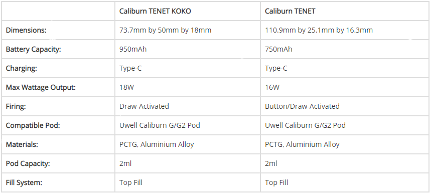 Uwell Caliburn Tenet Pod Kit, è dotato di una batteria interna da 750 mAh, uscita 16 W, USB Type-C, capacità del succo da 2 ml, costruzione robusta e compatibilità con le bobine Caliburn G e G2. Inoltre, TENET può avvalersi dei pod e delle bobine Caliburn G o G2.