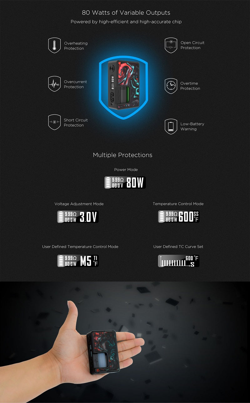Vandy Vape Pulse 80W BF Mod ispirato a Tony B. In termini di Gamma Resistenze, il Pulse 80W funziona da 0,05 a 3,0 ohm in modalità Variable Wattage e da 0,05 a 1,5 ohm in modalità Controllo della temperatura. La gamma di temperature va da 200-600℉ (100-315°C). La suite Controllo della temperatura include un'impostazione Nickel, Titanium e acciaio inossidabile, oltre a una funzione Bypass se si desidera eseguirla in modo simile a squonchi o mech più vecchi. Oltre a questa personalizzazione, Vandy Vape Pulse 80W offre sia un'impostazione della curva di Wattaggio variabile definita dall'utente, sia un'impostazione della curva di Controllo della temperatura per ottenere un'esclusiva trazione del tuo mod. Con uno schermo OLED da 0,91 "con un'interfaccia di controllo a tre pulsanti, puoi accedere e regolare tutte queste funzioni con facilità e precisione.