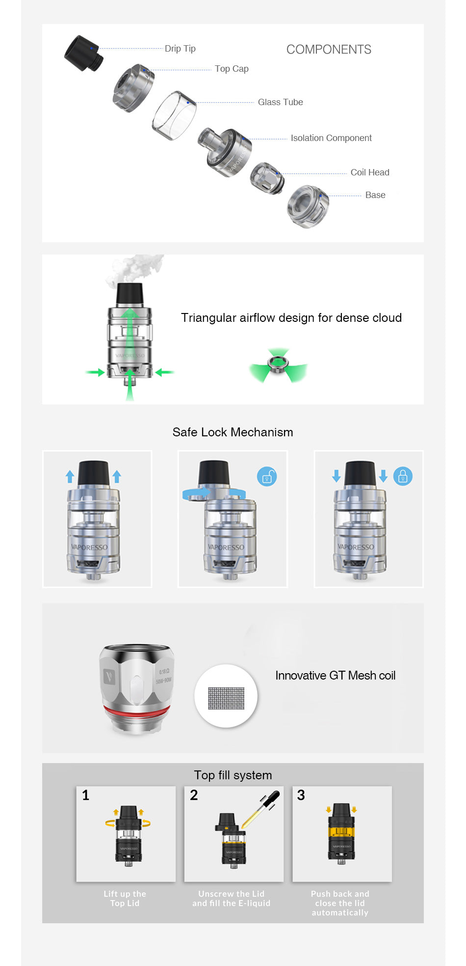 L'atomizzatore Sub Ohm Vaporesso Cascade Baby / Mini è il nuovo membro della famiglia Cascade. L'esclusiva struttura di isolamento è adattata per ridurre il potenziale colpo secco, e la separazione della camera della bobina e del succo allunga la durata della bobina, permettendo sapori consistenti e intensi ad ogni boccata. L'atomizzatore Cascade Baby / Mini è compatibile con i core GT, la cui innovativa tecnologia consente di produrre nuvole più dense e sapori più puri con un wattaggio inferiore. Grazie al design triangolare del flusso d'aria, l'atomizzatore Cascade Baby / Mini ti offre un vapore morbido, e il meccanismo di blocco di sicurezza del top cap evita efficacemente perdite.