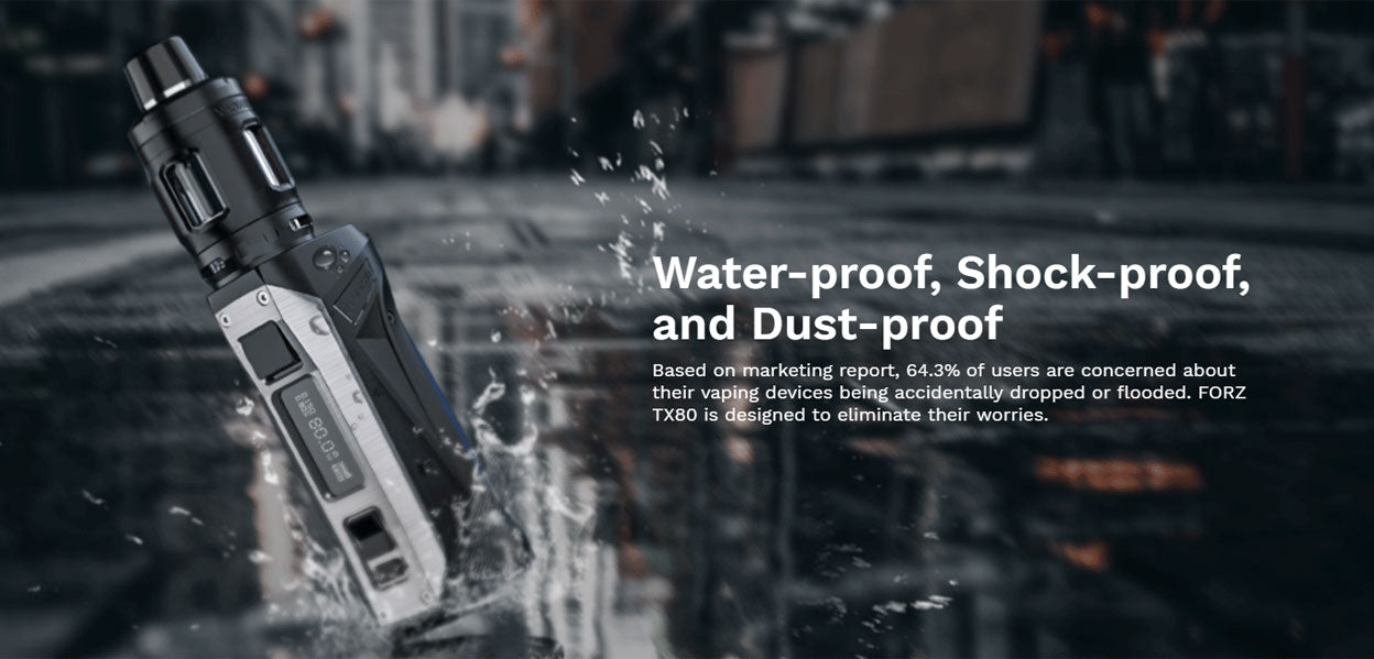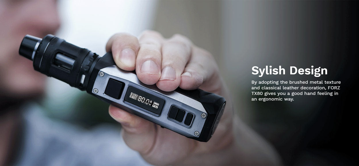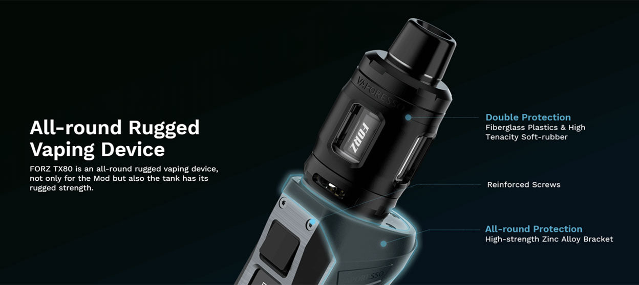 Vaporesso FORZ TX80 Kit è un robusto kit di vape box mod a tutto tondo che presenta una funzione impermeabile, antiurto e antipolvere. Si compone di Vaporesso FORZ TX80 Mod e un nuovo robusto atomizzatore FORZ 25. FORZ TX80 adotta una struttura in metallo spazzolato e una classica decorazione in pelle. La struttura ergonomica del profilo offre una buona sensazione della mano. Il guscio del dispositivo è composto da viti rinforzate e staffe in lega di zinco ad alta resistenza, fornendo una protezione a tutto tondo. Alimentato da un singolo 18650, Vaporesso FORZ TX80 MOD raggiunge una potenza regolabile da 5W a 80W. Il MIL-STD-810G che FORZ TX80 ha qualificato, è un insieme di test eseguiti su un pezzo di equipaggiamento affinché il Dipartimento della Difesa (DoD) si assicuri che possa resistere alle dure imprese di un'impresa militare. Il Vaporesso FORZ TX80 adotta la nuova modalità di svapo di F (t). F (t) è una modalità trasformativa sviluppata per ottenere un balzo senza precedenti nel rilascio del sapore. L'atomizzatore Vaporesso FORZ 25 ha una capacità di succo di 4,5 ml con sistema di bobina sostituibile. Il telaio protettivo garantisce un utilizzo robusto e durevole dell'atomizzatore Vaporesso FORZ. La sostituzione della bobina Pull & Push facilita le operazioni dell'utente. Il nuovo atomizzatore GTR Coil di Vaporesso FORZ ha un sapore duraturo e un'eccellente conduttività del liquido.