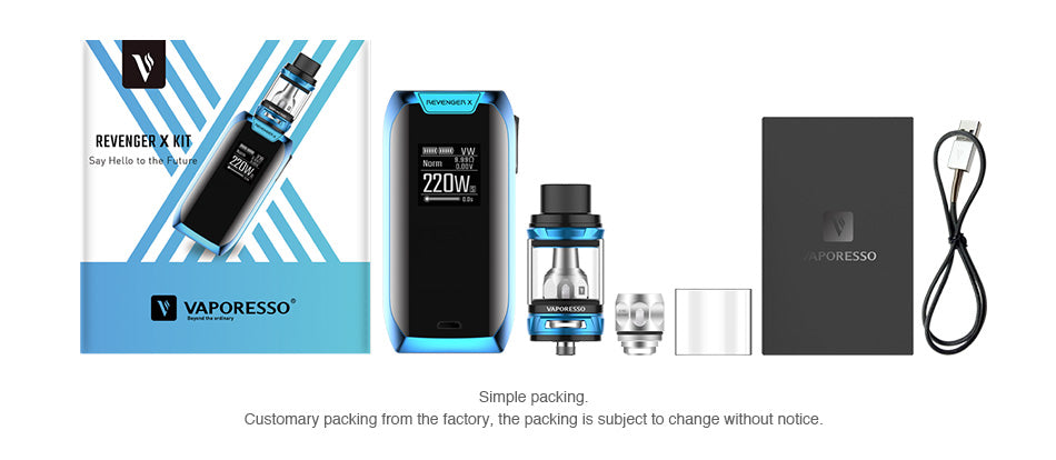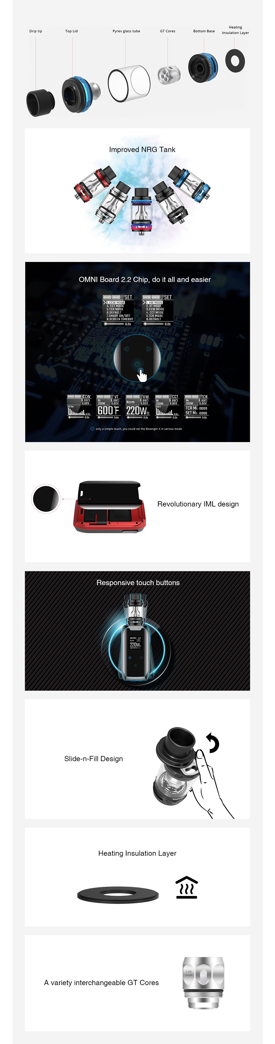 Ecco lo Starter Kit Vaporesso Revenger X da 220 W con Tank NRG, mod vapore compatto con schermo OLED da 0,96 pollici e Tank avanzato per lo svapo, che misura perfettamente 45 mm * 89 mm * 28 mm. Il sistema di riempimento a scorrimento scorrevole consente ai vapers di spingere e tirare il tappo superiore per ricaricare facilmente l'e succo. Il Tank si impacca con un tubo di vetro in Pyrex per una migliore dissipazione del calore. Il sistema di flusso d'aria inferiore può generare una produzione di vapori e un sapore bilanciati, e puoi regolare l'anello del flusso d'aria in base alle tue esigenze. Vaporesso Revenger X Box Mod, alimentato da due batterie 18650 con enorme potenza, funziona con la potenza massima di 220W. Presenta uno strato di isolamento termico, con un rivoluzionario design IML, che si riflette nell'immersivo e più integrato aspetto con pulsanti touch sensibili. Sono disponibili una varietà di core GT intercambiabili, che presentano tutti i parametri in modo chiaro. Dotato di Tank NRG migliorato, ti assicurerai di goderti il sapore e i vapori della varietà di nucleo GT disponibile.