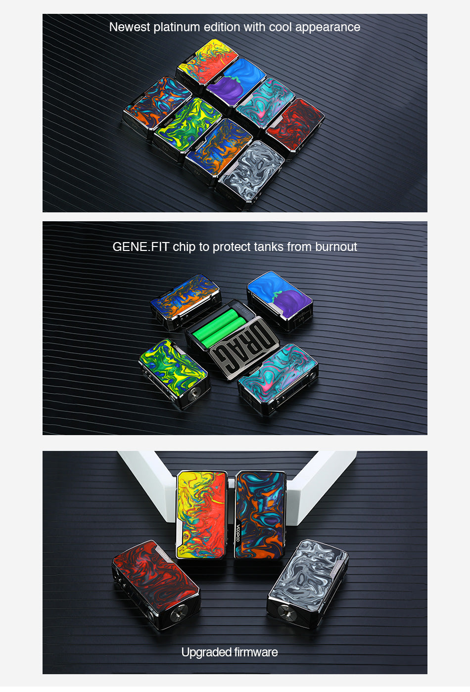 Arriva il Voopoo Drag 2 Platinum TC Box Mod! Il VOOPOO Drag 2 Platinum è dotato di un innovativo chip genico con regolazioni multiple di potenza, come Set di sapori, Set di nuvole e Set di batterie. Allo stesso tempo, può ottimizzare l'efficienza della batteria al massimo grado. Inoltre, la modalità FIT con un ponte antincendio classe V0 vanta la sua elevata sicurezza che può eguagliare e proteggere i serbatoi dal burnout, dai blocchi di polvere e liquidi. Vale la pena ricordare che il Platinum Drag 2 ha un design ergonomico con superficie curva e angoli arrotondati per una sensazione di mano confortevole. Aggiungi costruzione in lega di zinco resistente e portatile e resina con schermo OLED trasparente, il Vo Boxo Drag 2 Platinum TC Box Mod è uno dei migliori prodotti per te grazie alla sua alta qualità e al suo basso costo.