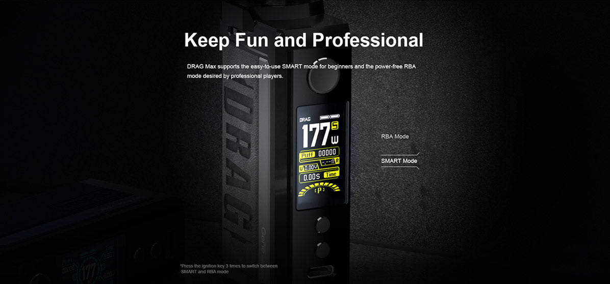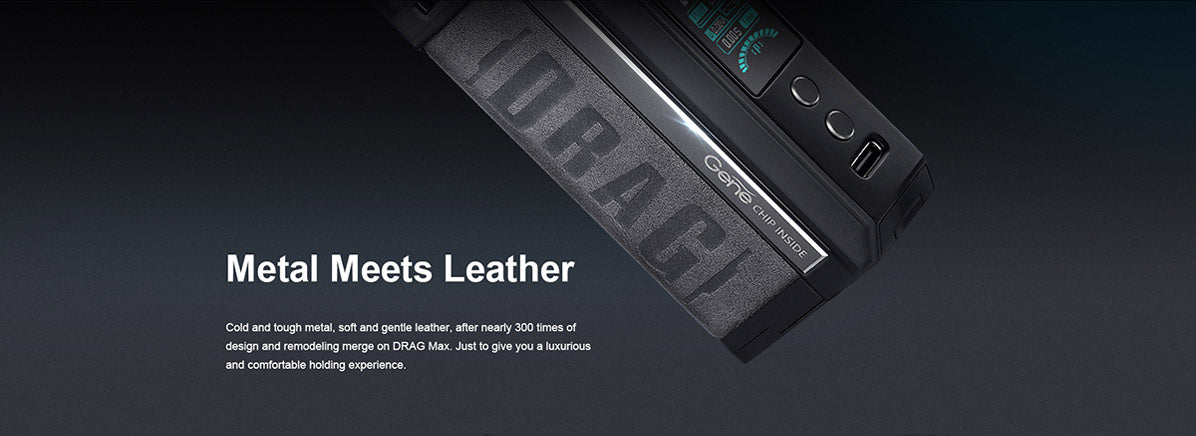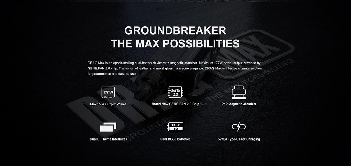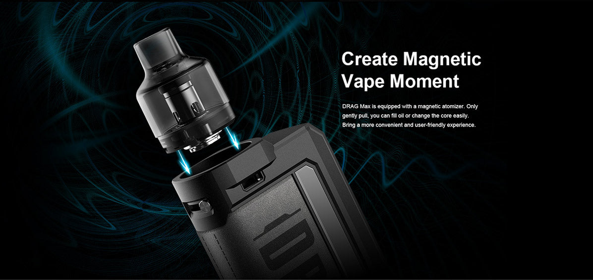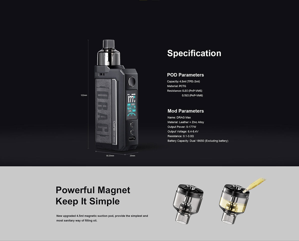 VOOPOO Drag Max rompe la definizione di dispositivi di svapo tradizionali, che è un dispositivo a doppia batteria epocale con un atomizzatore magnetico. È alimentato da due batterie 18650 con gamma di potenza 5-177 W. Realizzato in metallo e pelle, è resistente e delicato. Il chip GEME.FAN 2.0 recentemente aggiornato offre a Drag Max alcune funzioni innovative, come l'accensione estrema di 0,001 secondi, l'uscita dinamica stabile, l'interattività intelligente. Viene fornito con due temi dell'interfaccia utente di stili diversi, puoi goderti i due temi con uno schermo a colori TFT da 1,08 pollici. Inoltre, Drag Max offre due modalità per soddisfare le diverse esigenze di svapo: modalità SMART di facile utilizzo per i principianti, modalità RBA senza alimentazione per vpers professionali. Ha una compatibilità universale dell'atomizzatore: PnP Pod, PnP MTL Pod, PnP RTA Pod e puoi usare quello che ti piace con Drag Max.È anche compatibile con tutte le PnP bobine. La capacità dell'e-juice è di 4,5 ml.