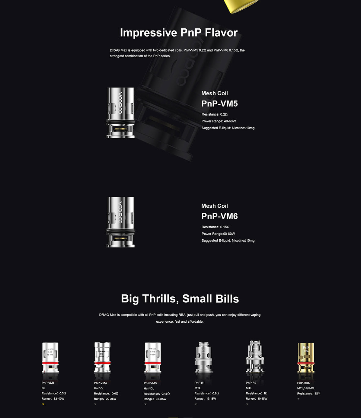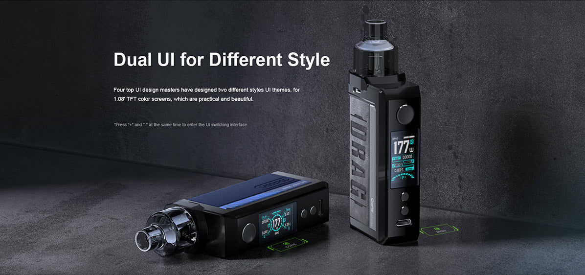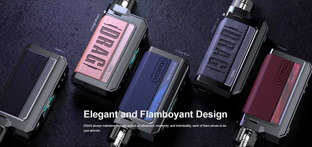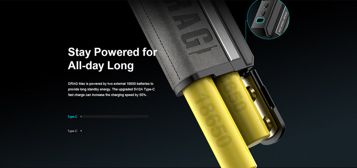 VOOPOO Drag Max rompe la definizione di dispositivi di svapo tradizionali, che è un dispositivo a doppia batteria epocale con un atomizzatore magnetico. È alimentato da due batterie 18650 con gamma di potenza 5-177 W. Realizzato in metallo e pelle, è resistente e delicato. Il chip GEME.FAN 2.0 recentemente aggiornato offre a Drag Max alcune funzioni innovative, come l'accensione estrema di 0,001 secondi, l'uscita dinamica stabile, l'interattività intelligente. Viene fornito con due temi dell'interfaccia utente di stili diversi, puoi goderti i due temi con uno schermo a colori TFT da 1,08 pollici. Inoltre, Drag Max offre due modalità per soddisfare le diverse esigenze di svapo: modalità SMART di facile utilizzo per i principianti, modalità RBA senza alimentazione per vpers professionali. Ha una compatibilità universale dell'atomizzatore: PnP Pod, PnP MTL Pod, PnP RTA Pod e puoi usare quello che ti piace con Drag Max.È anche compatibile con tutte le PnP bobine. La capacità dell'e-juice è di 4,5 ml.
