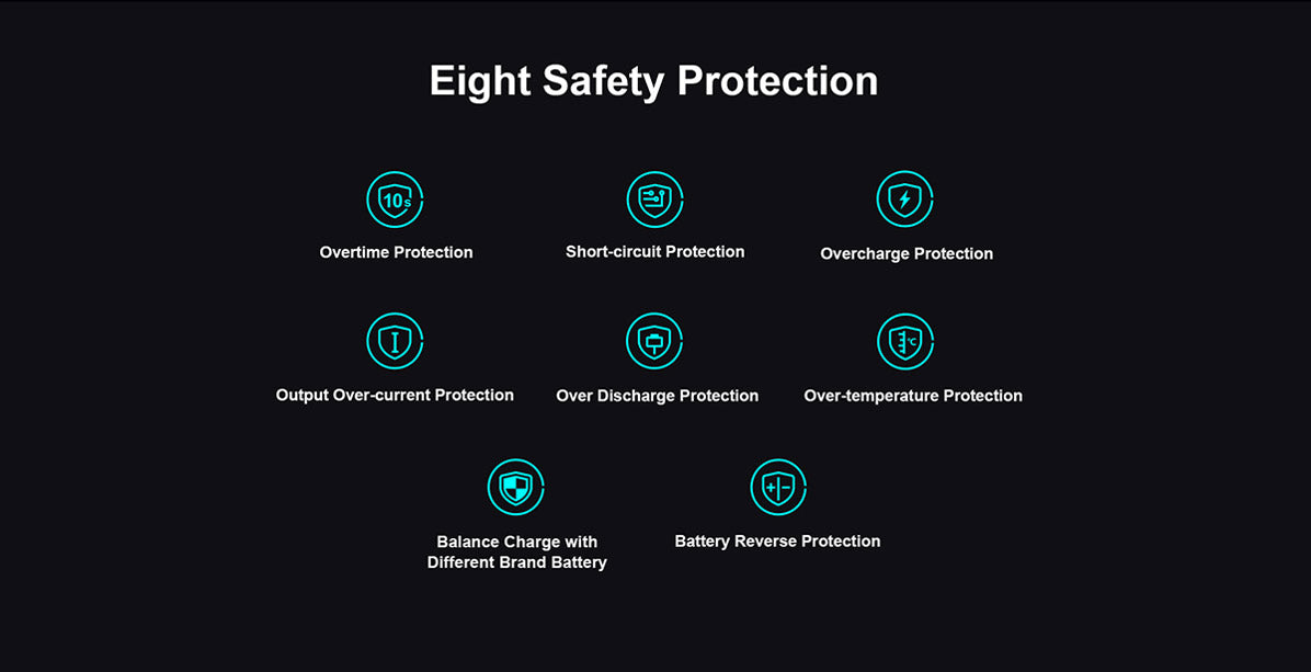 Protezioni: Straordinario / Cortocircuito / Sovraccarico / Sovracorrente in uscita / Sovraccarico / Sovratemperatura / Carica bilanciata con batteria di marca diversa / Protezione inversione batteria