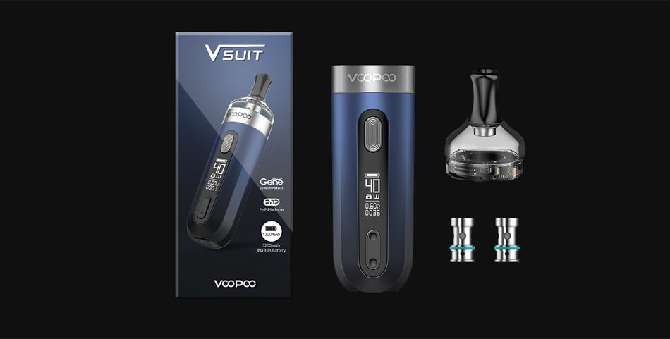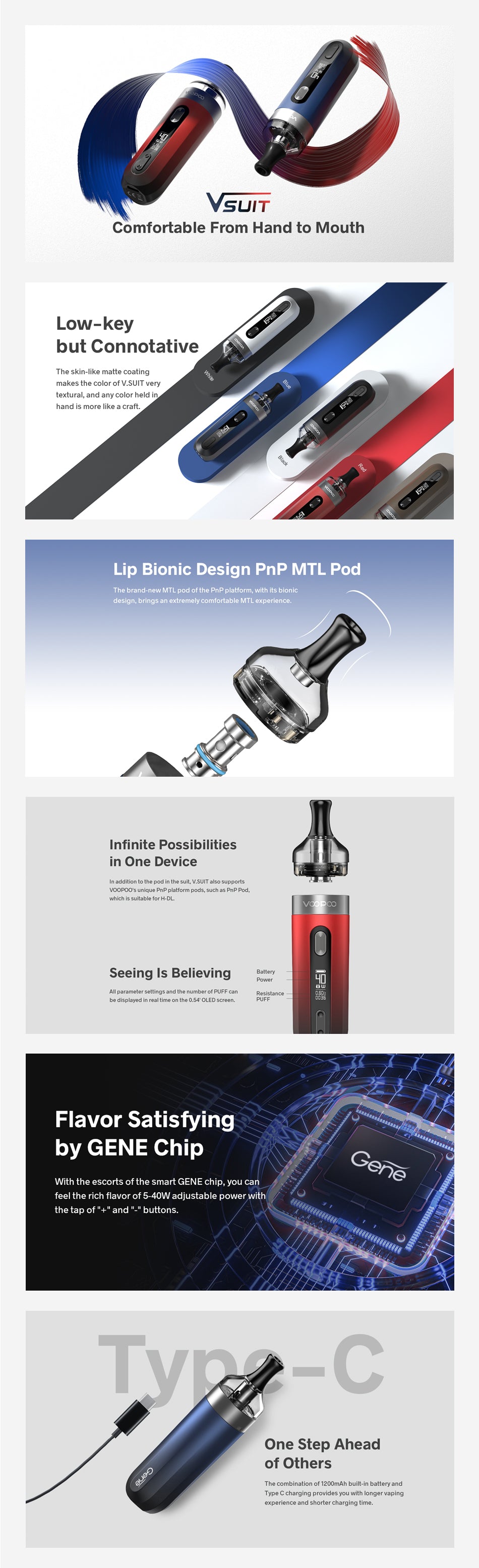 Voopoo V.SUIT Kit è un kit pod iniziale unico che è comodo dalla mano alla bocca e porterà a un nuovo livello di esperienza tattile e gustativa. Ha una batteria integrata da 1200 mAh con intervallo di potenza regolabile da 5 a 40 W e ricarica rapida di tipo C. È possibile visualizzare tutte le impostazioni dei parametri e il numero di PUFF con uno schermo OLED da 0,54 pollici. Con il nuovissimo PnP MTL Pod dal design bionico da 2 ml, fornirà un grande divertimento MTL. Inoltre, V.SUIT supporta anche gli esclusivi pod della piattaforma PnP del marchio, come PnP Pod. V.SUIT viene fornito con bobine PnP-TR1 e PnP-TM2 aggiornate per offrirti un sapore e una risoluzione MTL migliori. Inoltre, è anche compatibile con bobine PnP da 0.3ohm e oltre, puoi scegliere quella che desideri.