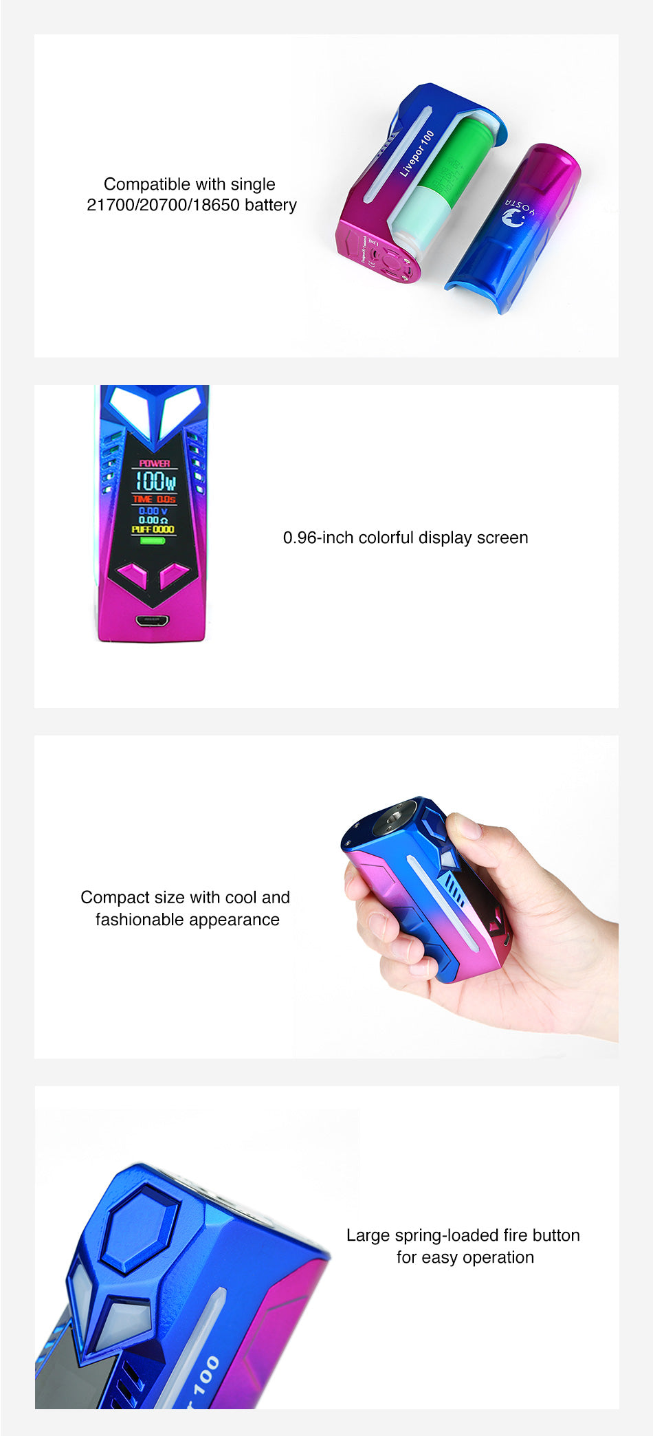 Yosta Livepor 100W TC Box MOD, una versione aggiornata di Yosta Livepor, è un MOD molto bello e alla moda con design ergonomico che sembra trasformatore. Yosta Livepor 100W MOD funziona con una singola batteria 21700/20700/18650, che può raggiungere la potenza massima di 100W. Il chipset avanzato utilizzato offre una velocità di sparo veloce pari a 0,01 secondi. Dotato di schermo OLED da 0,96 pollici, puoi controllare facilmente i dati. Inoltre, viene fornito con un indicatore LED per la visualizzazione della potenza residua. 3 colori tra cui scegliere.