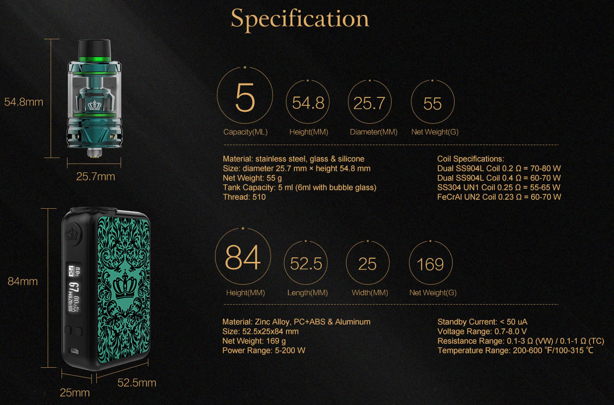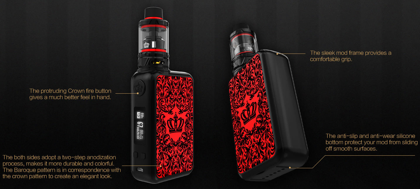 Il UWELL Crown 4/IV 200W TC Kit è il nuovo prodotto con un design artigianale raffinato e alla moda, che consistono in un Crown 4 atomizzatore e Crown 4 mod. Uwell Crown IV Box Mod è alimentato da due batterie 18650 ed è in grado di produrre 200 W di potenza massima. Supporta la modalità di alimentazione regolare e la modalità di controllo della temperatura che può estendere la durata e la protezione dello span. Equipaggiato con la nuova generazione di circuiti stampati UWELL è più resistente alla polvere e alla corrosione, con un design unico del modello barocco, il Crown 4 Mod ti offre una fantastica esperienza visiva. UWELL Crown IV Mod è caratterizzato da una lavorazione squisita con dettagli ingegnosi, il fondo in silicone antiscivolo impedisce al tuo mod di scivolare sulle superfici. C'è un pulsante di fuoco sul mod che conferisce un aspetto elegante e fornisce una presa migliore. Uwell Crown 4 Atomizzatore regge una capacità di 6 e succo e 5ml di vetro dritto per te. Il più grande highlight di Crown 4 è l'avanzata tecnologia autopulente brevettata, l'Uwell Crown 4 è in grado di assorbire l'e succo nel supporto per la condensazione attraverso un uso regolare e di vaporizzarlo. Inoltre, Crown IV Sub Ohm Atomizzatore utilizza una bobina UN1 con 0,25ohm nominale da 55W a 65W e la bobina UN2 0,23ohm con un intervallo di uscita da 60W a 70W. Il design della bobina a doppia elica riscalda in modo uniforme e completo per dare i buoni sapori. In una parola, il Crown IV Kit è un meraviglioso kit di vaporizzazione in grado di soddisfare allo stesso tempo la grande esperienza di vaping e il piacere visivo.